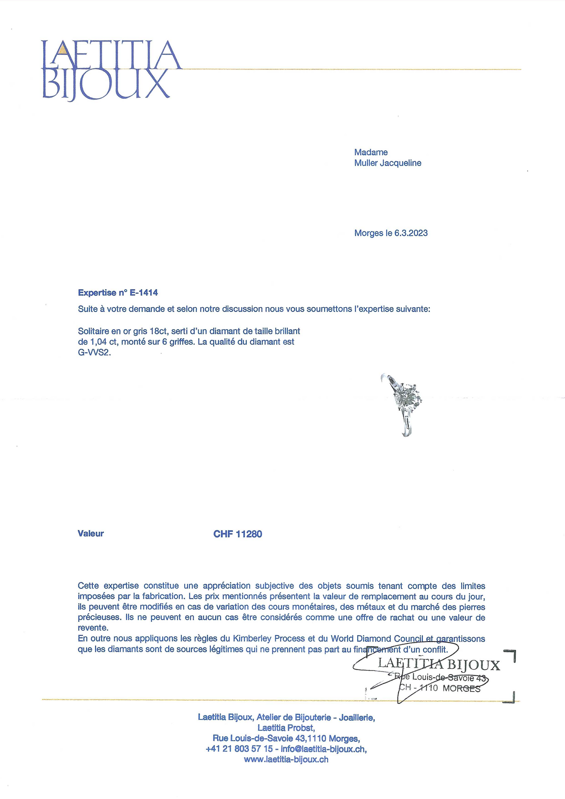 18 k White Gold Solitaire Ring, Brilliant cut diamond 1.04 c