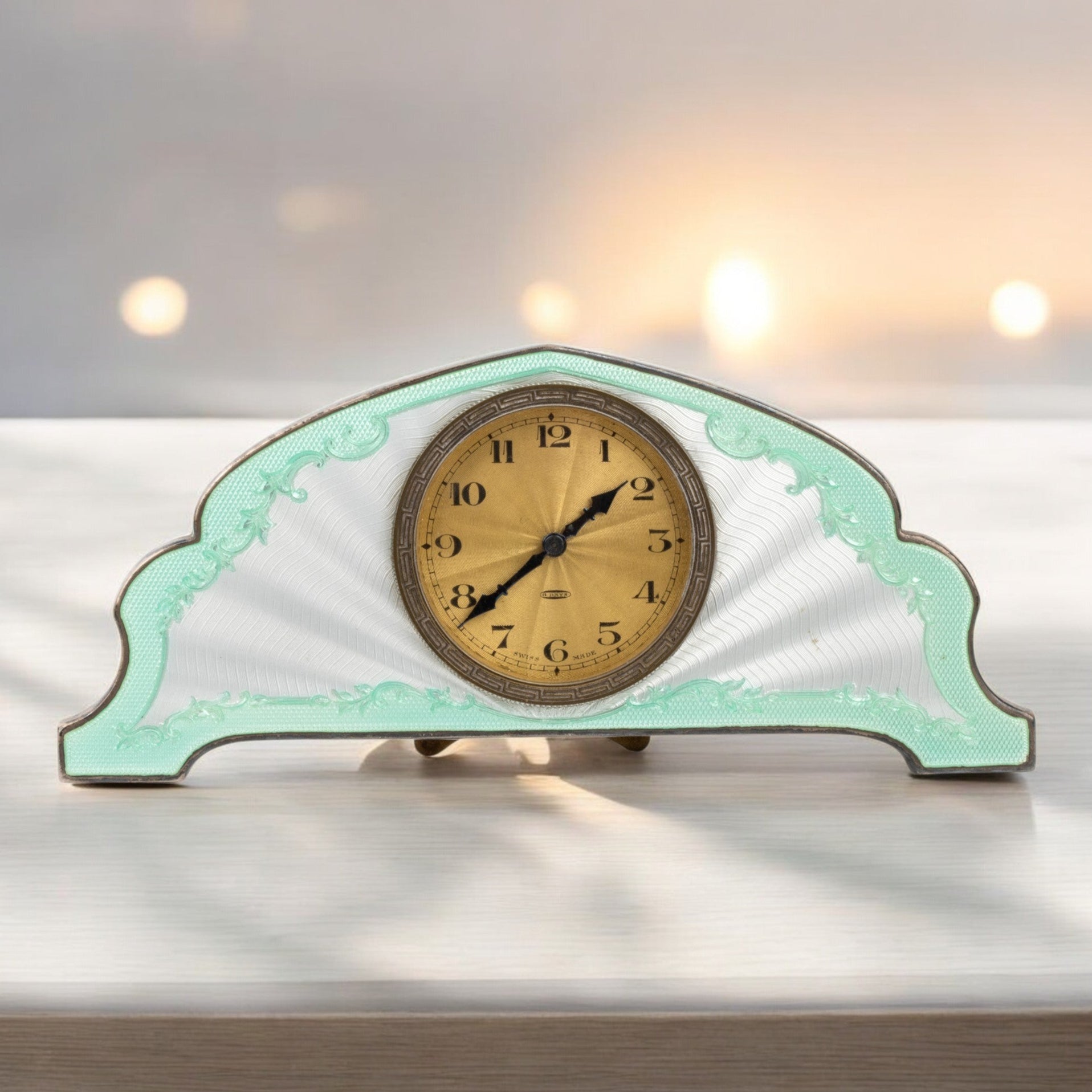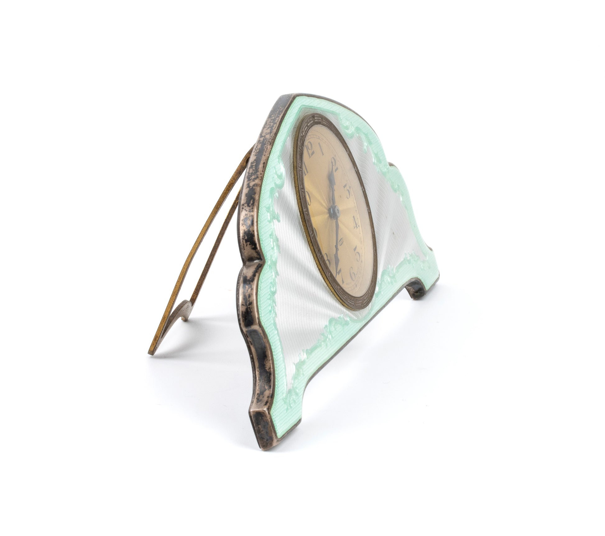 Shaped case in sterling silver with guilloché enamel in shades of green and white. Gilded dial with Arabic numerals, featuring the inscriptions "8 days - Swiss made".