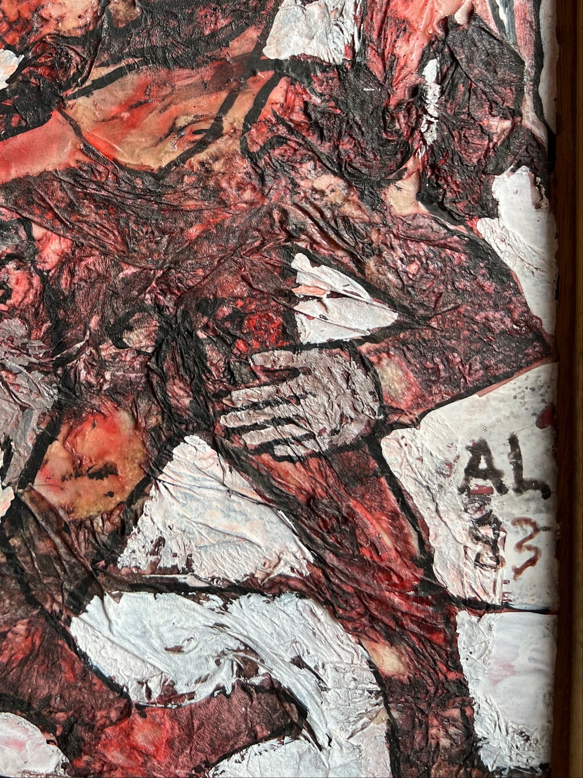 Lacoste’s treatment of the human form is raw and emotional, evoking themes of struggle, intimacy, and collective memory. The heavily textured surface enhances the dramatic tension of the scene, giving the impression that the figures are both trapped within and pushing against the painted matter itself. The restrained palette heightens the sense of urgency and psychological depth, while the abstracted forms invite prolonged contemplation.