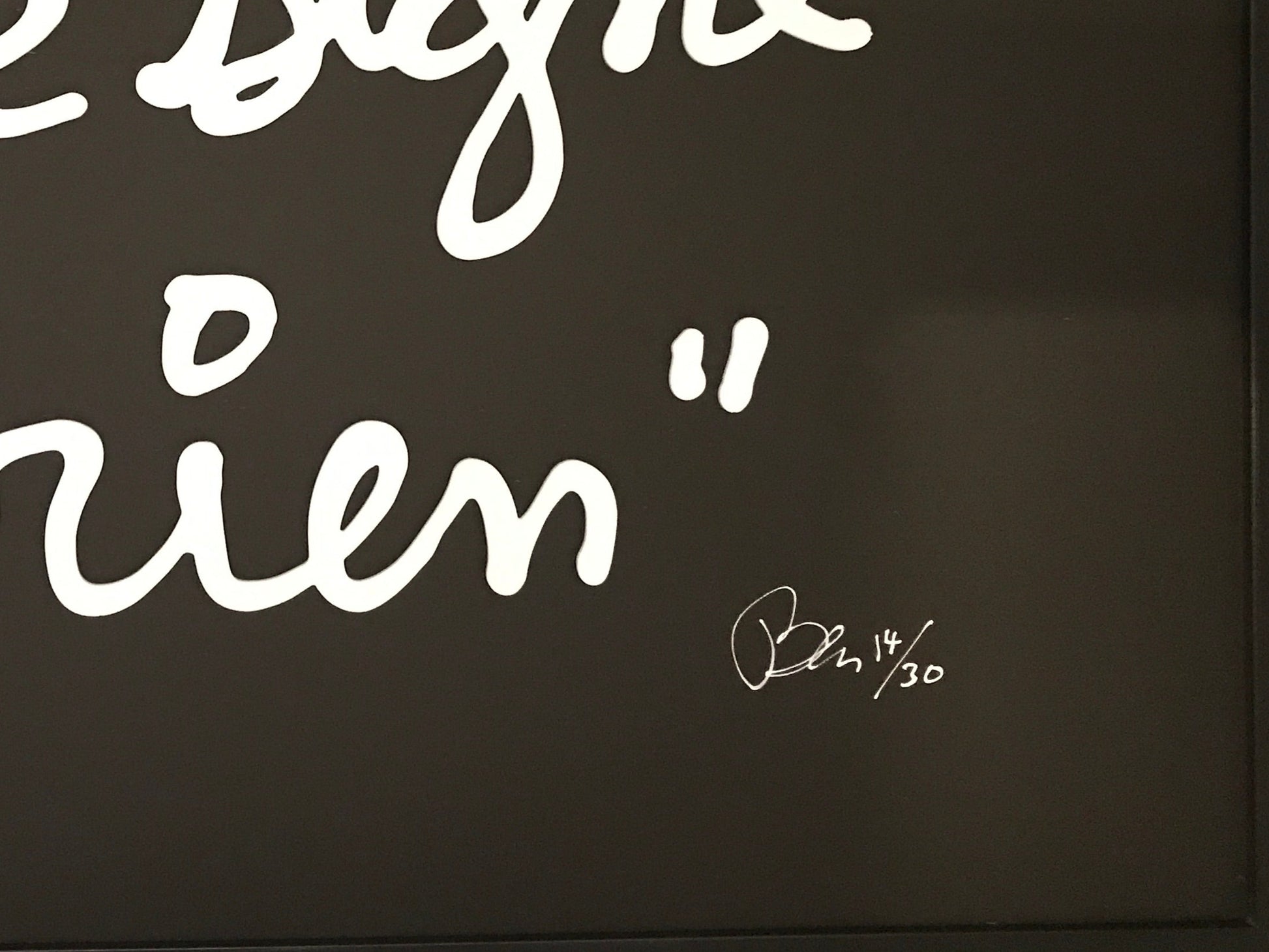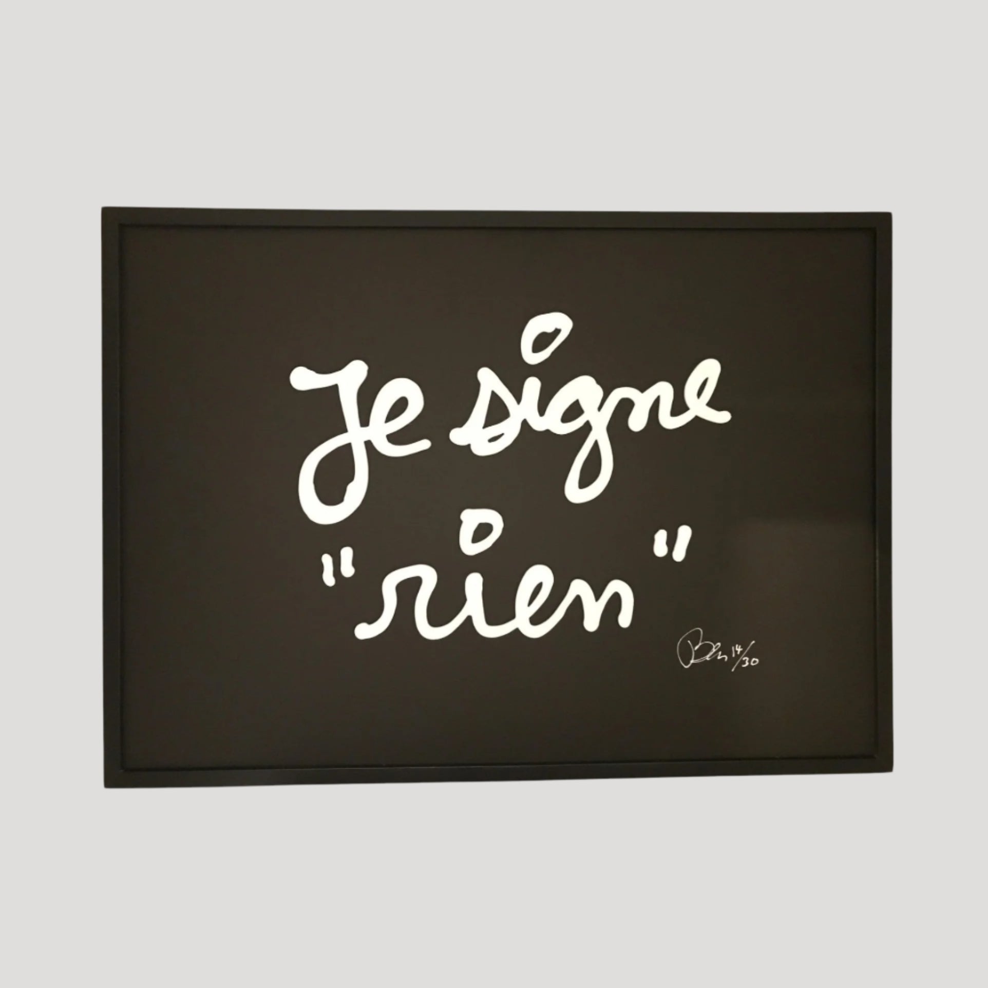 Text Art & Writing-Based Works: Ben is famous for his handwritten phrases, often in white cursive on a black background, addressing themes of truth, ego, and artistic meaning (e.g., "L’art est inutile" (Art is useless)).