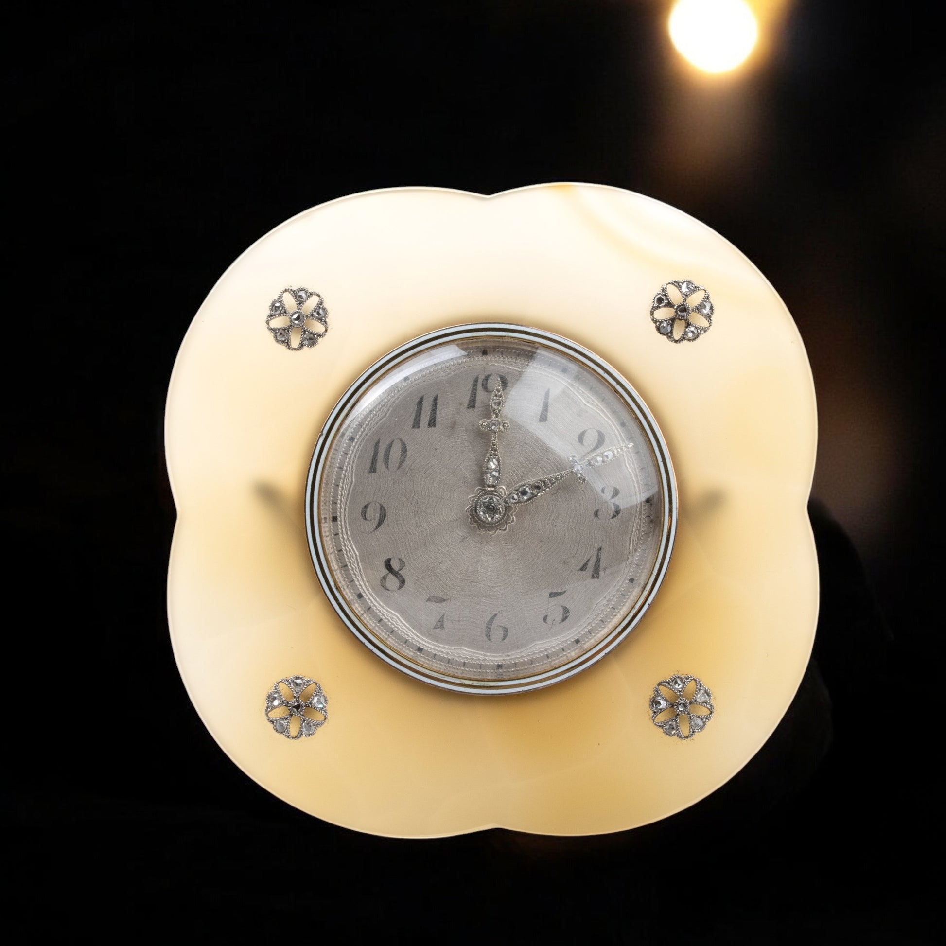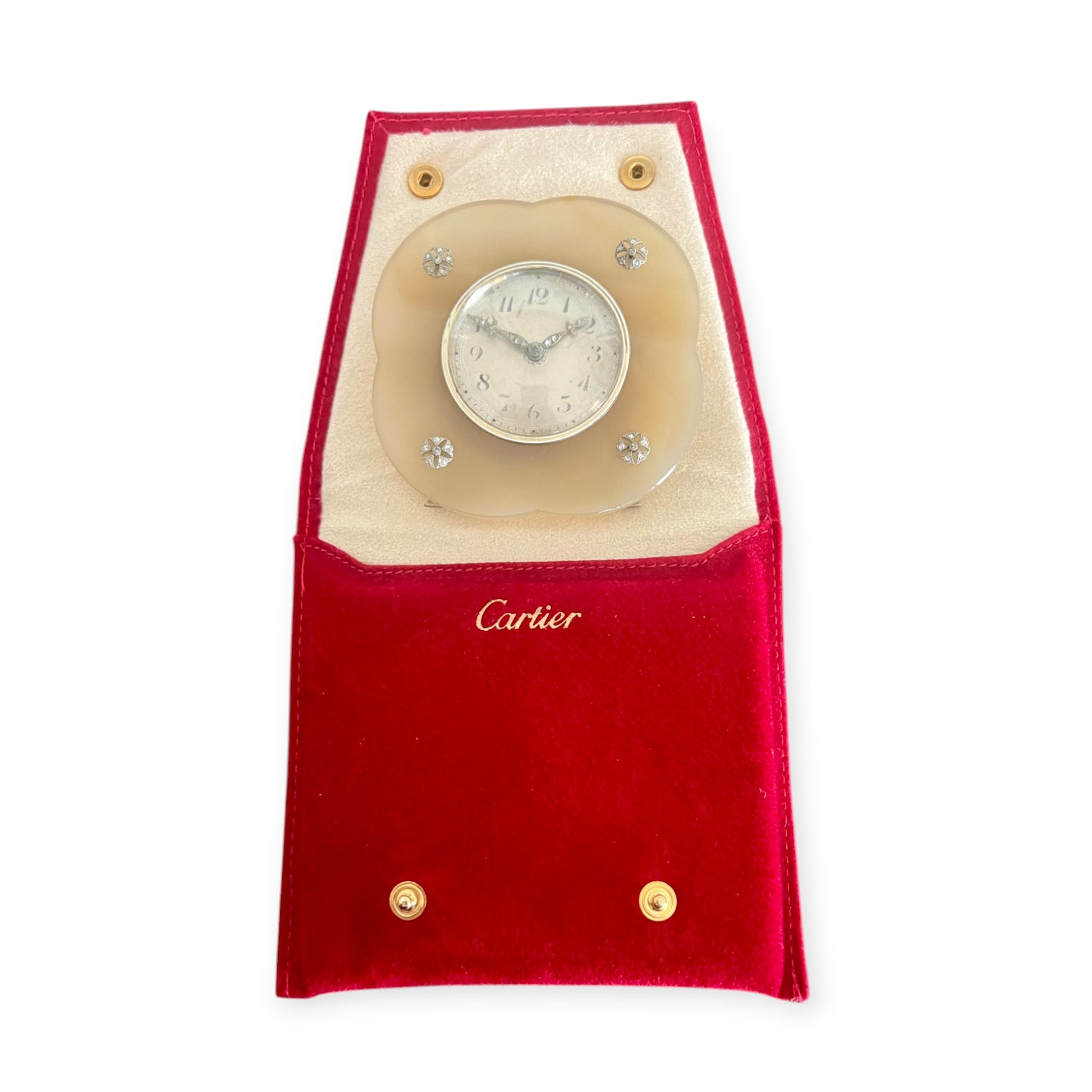 Cartier Art Déco agate and silver table clock / horloge/ tischuhr set with diamonds, 1920'