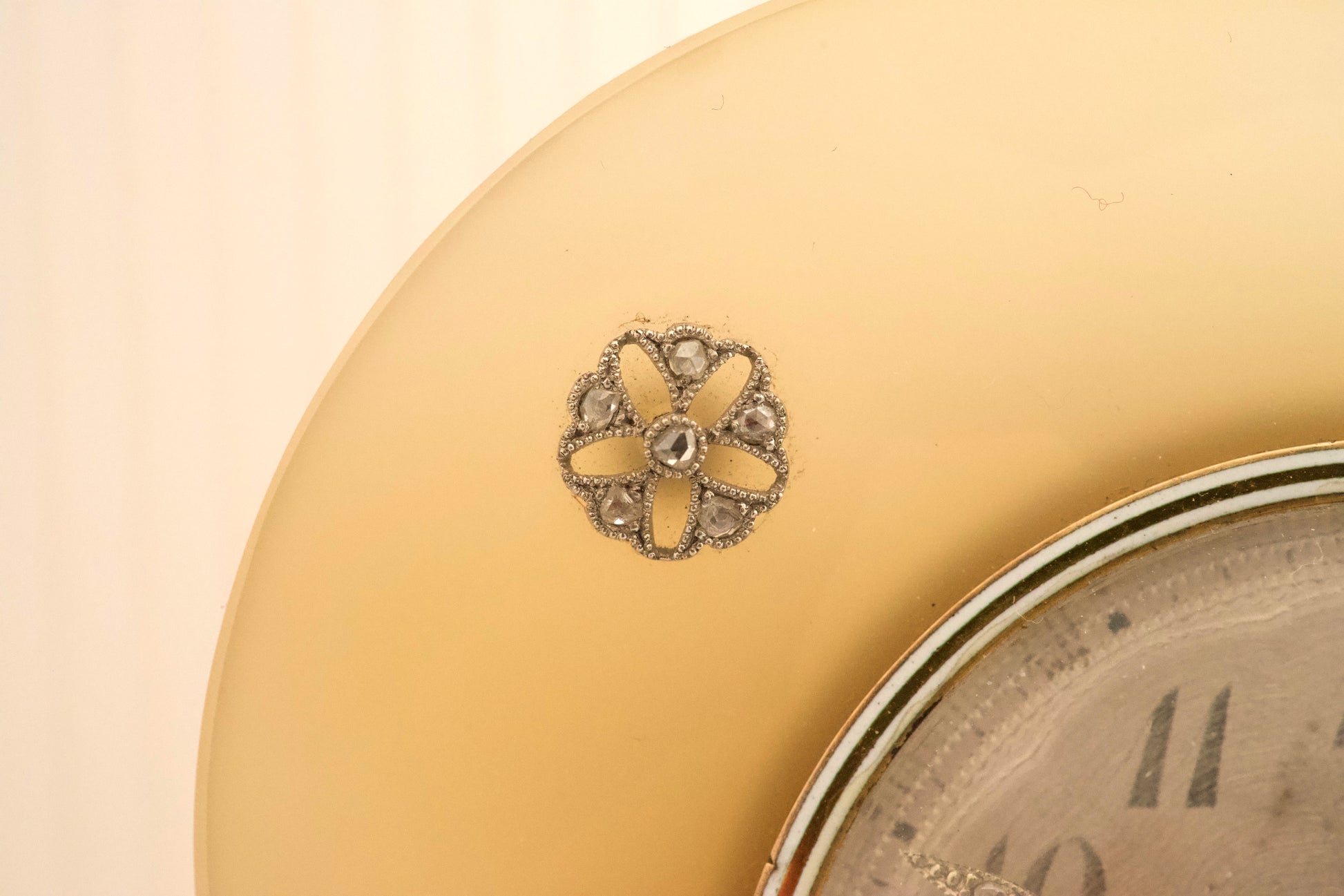 Silvered dial with Arabic numerals and diamond-set hour markers.