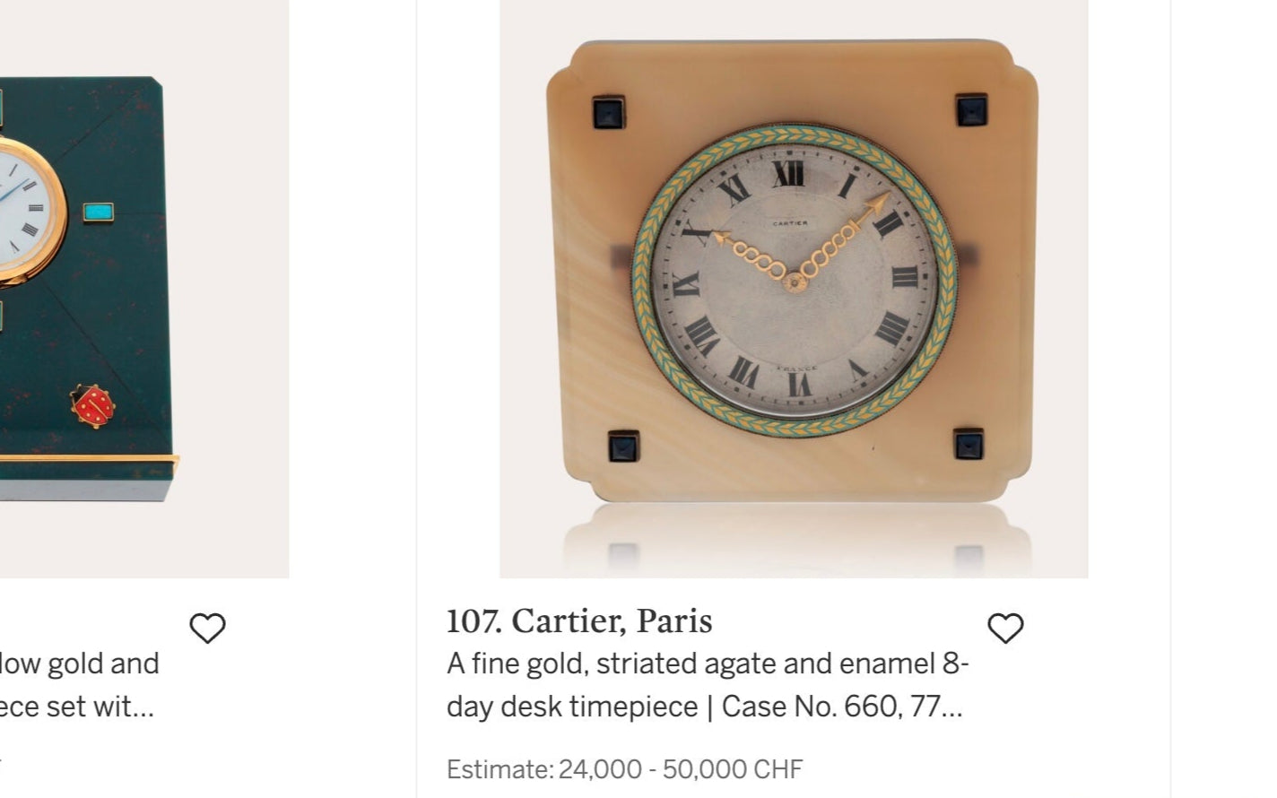An Art Deco nephrite, kingfisher feather, enamel, and diamond 'Borne' strut clock by Cartier, circa 1926, was sold for CHF 63,000 on November 7, 2023, at Christie's in Geneva.