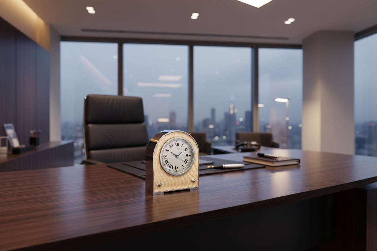 A fine and rare Cartier Stainless Steel & Enamel Alarm Desk Clock in its original Cartier box