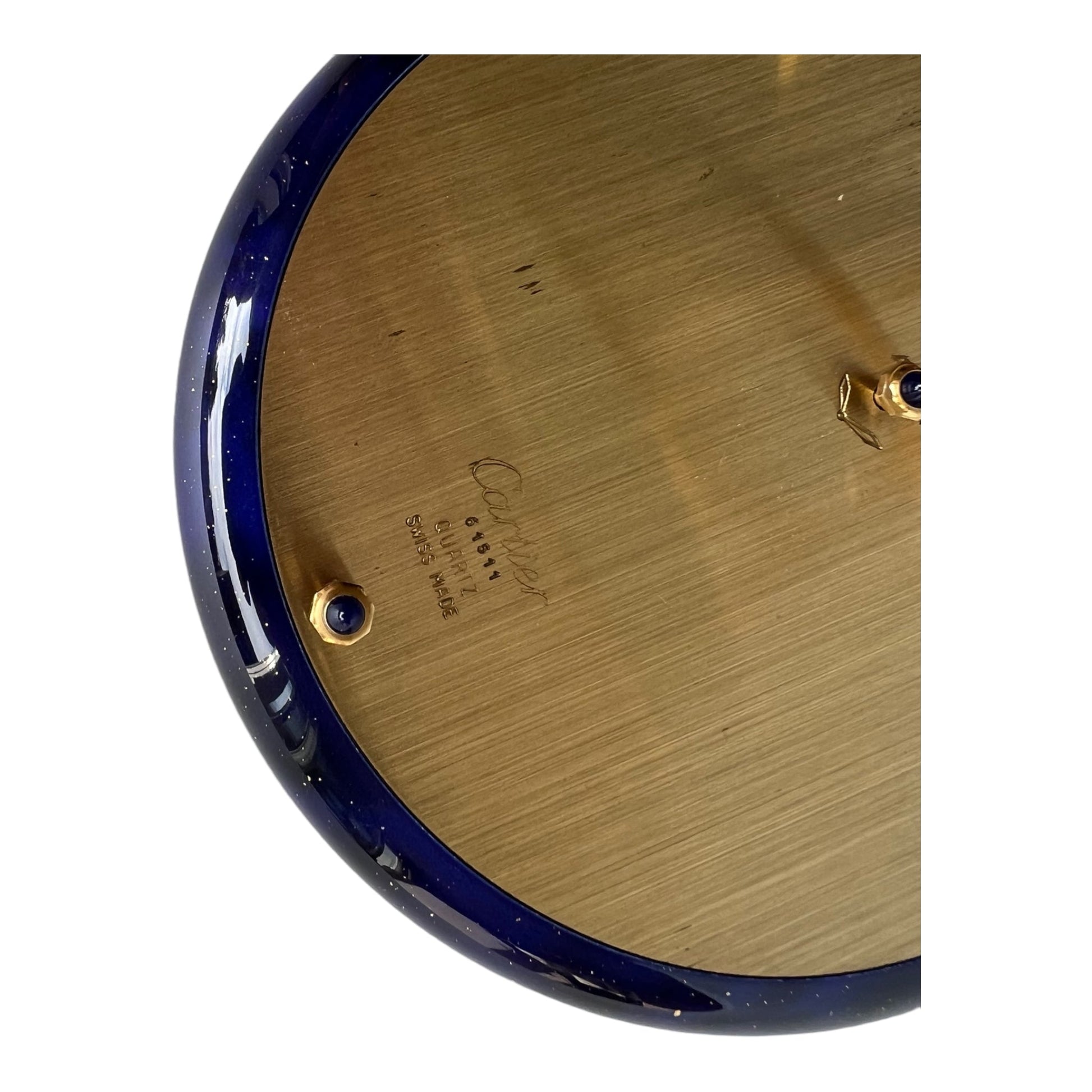 Art Deco-inspired desk clock in gilt metal with blue enamel decoration. Gilded dial with radiating decoration, three black enamelled cabochons on the bezel, feet for placing on the back, quartz
