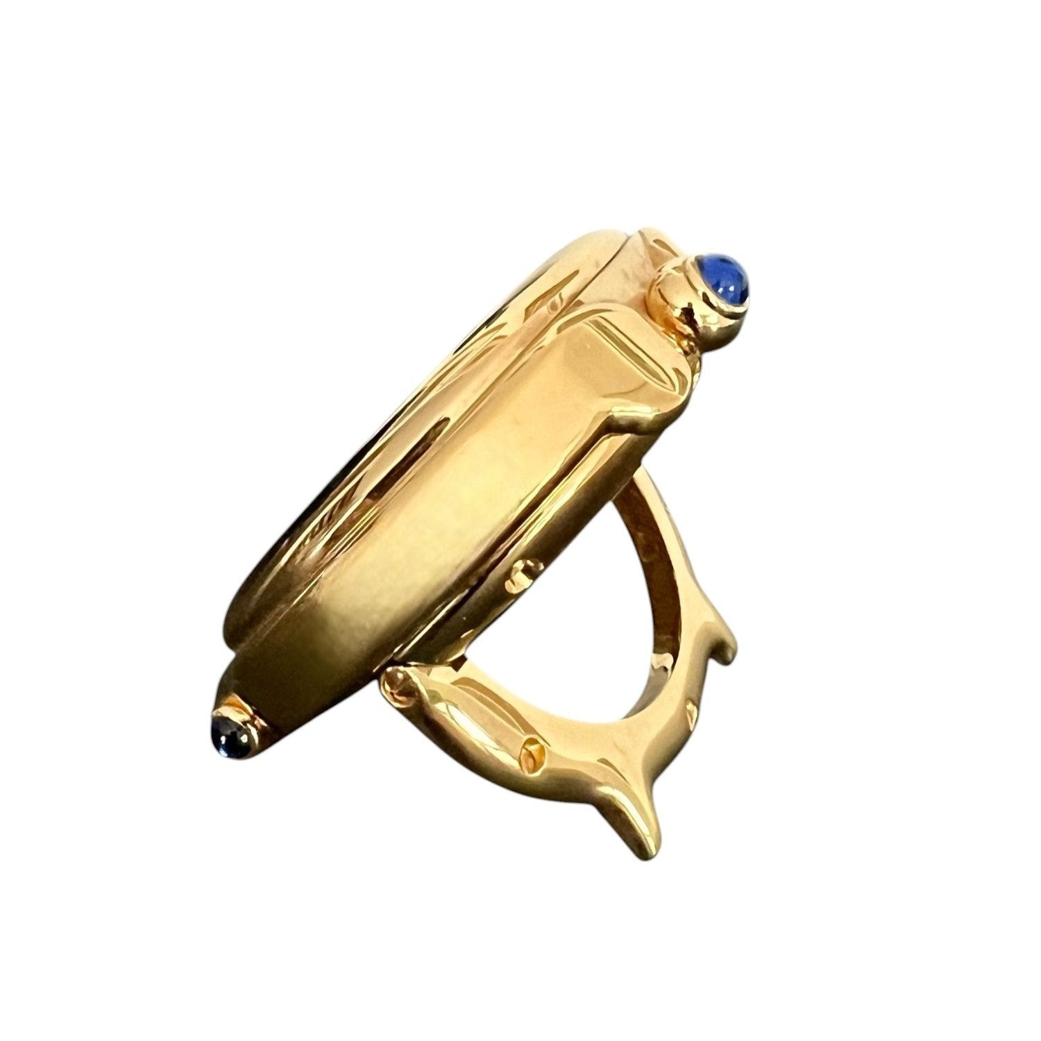 Case: Golden Round case with foldable stand, feet and pushers set with 1 sapphire cabochon.