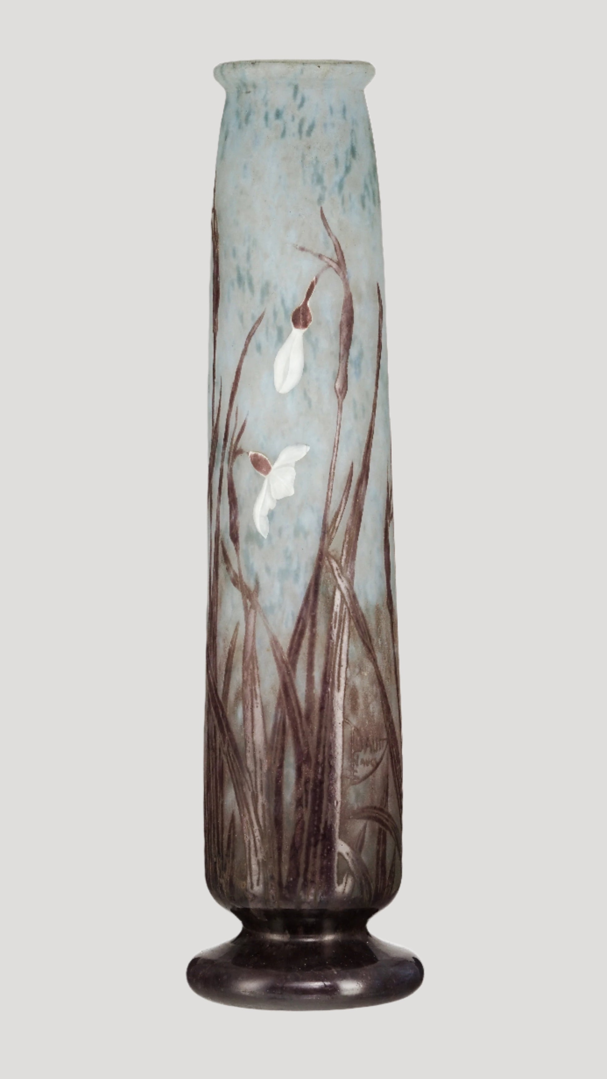 Magnificent Multi-layered glass vase signed Daum Nancy. Decorated with acid-etched snowdrops on a bluish marmorated ground