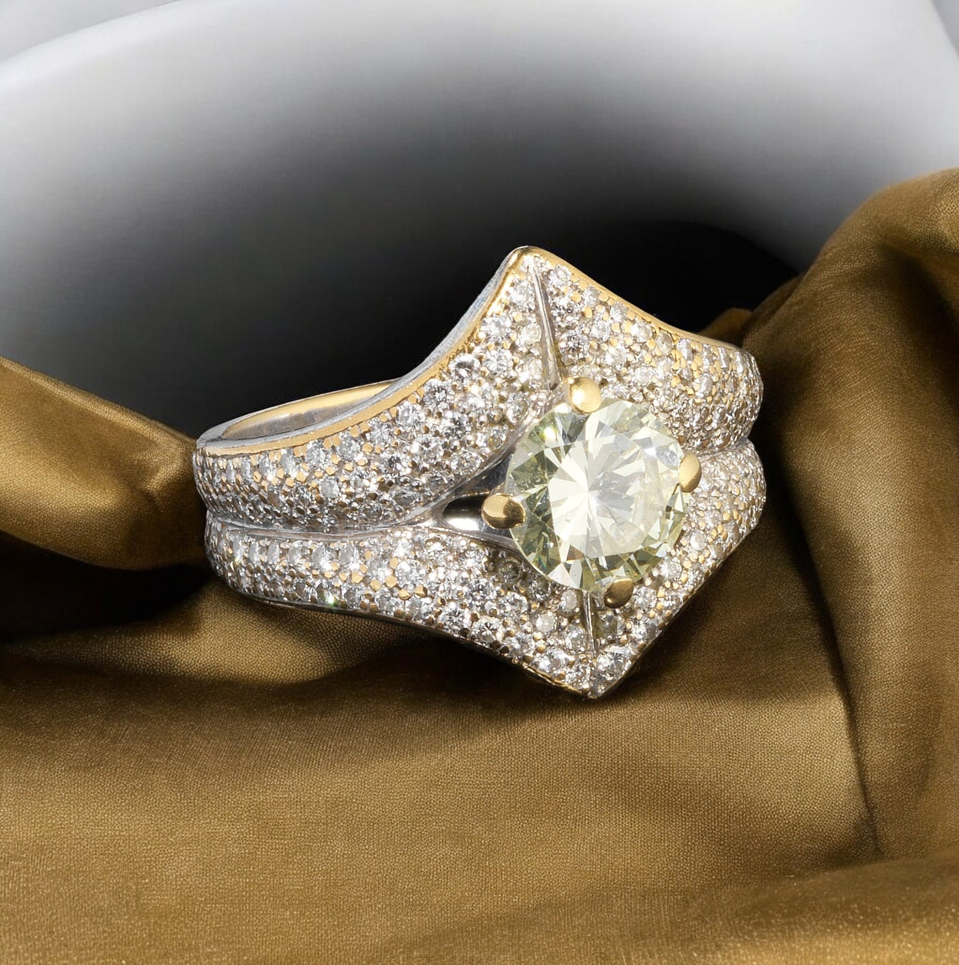 Design Solitaire 1kt fancy yellow diamond paved with ca.180 white diamonds 18k White Gold Ring