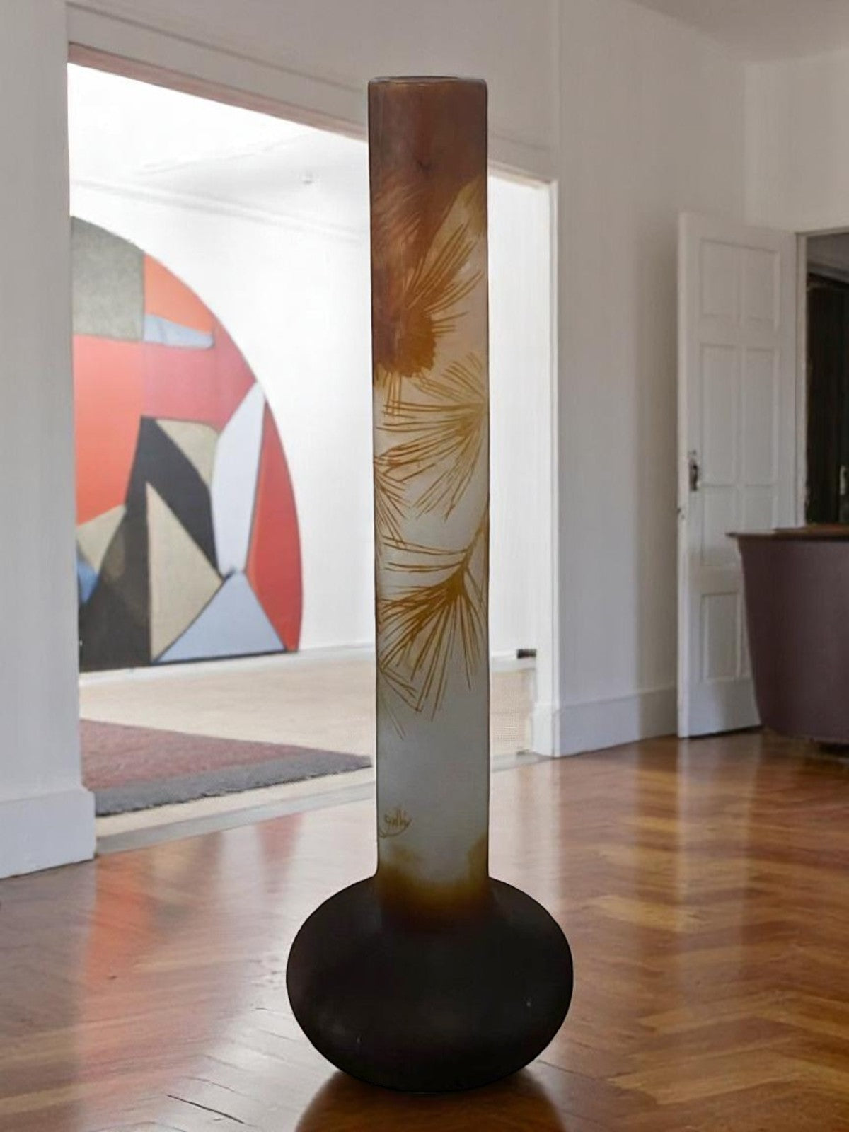 A fine & rare long-necked cylindrical vase in multi-layered glass signed Gallé. Decorated with pine branches, swollen base.