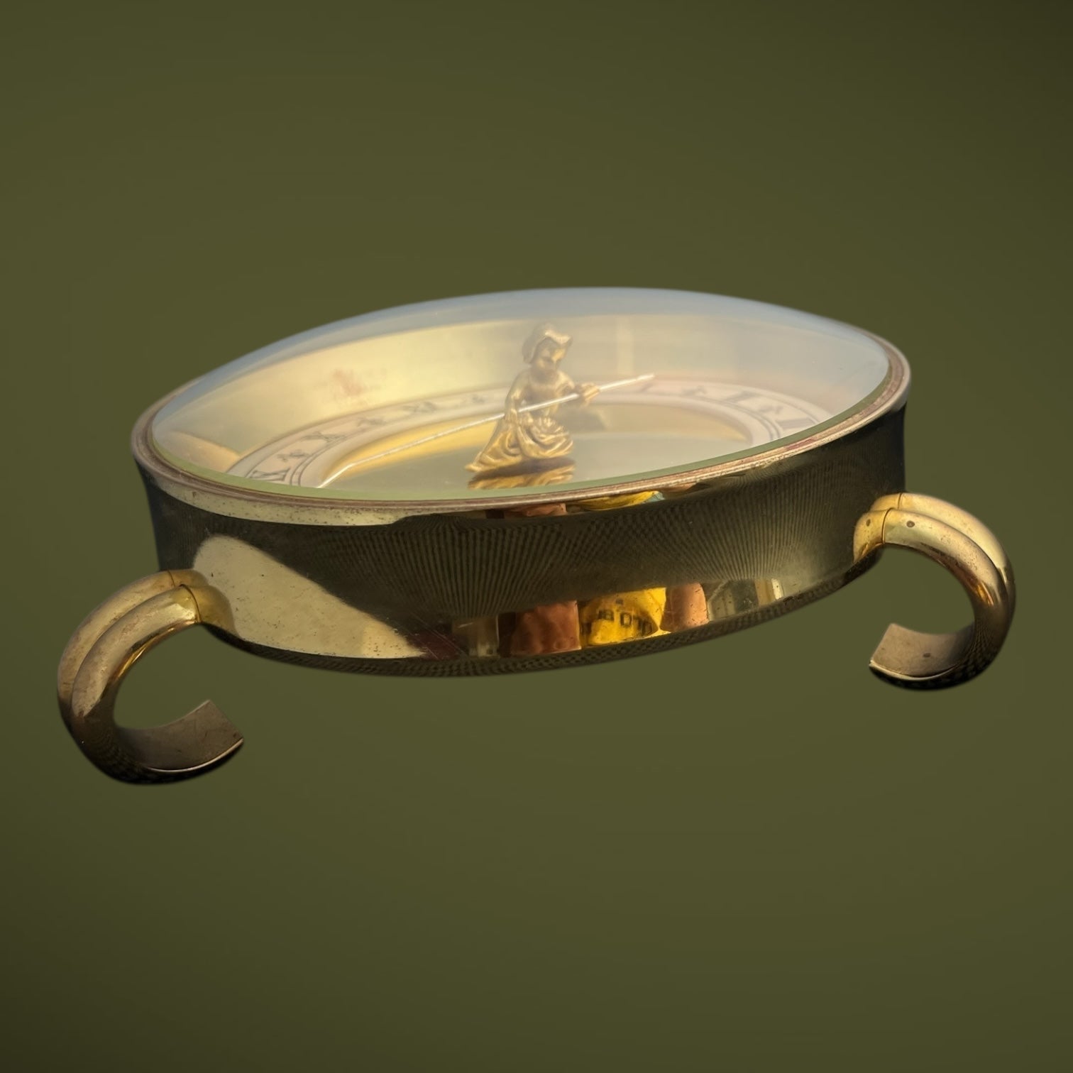 As is sometimes the case with vintage brass surfaces, the repolishing combined with a natural chemical reaction caused the original Gübelin signature to fade. This is a known and documented phenomenon on mid-century brass dials, especially when the signature was applied superficially.