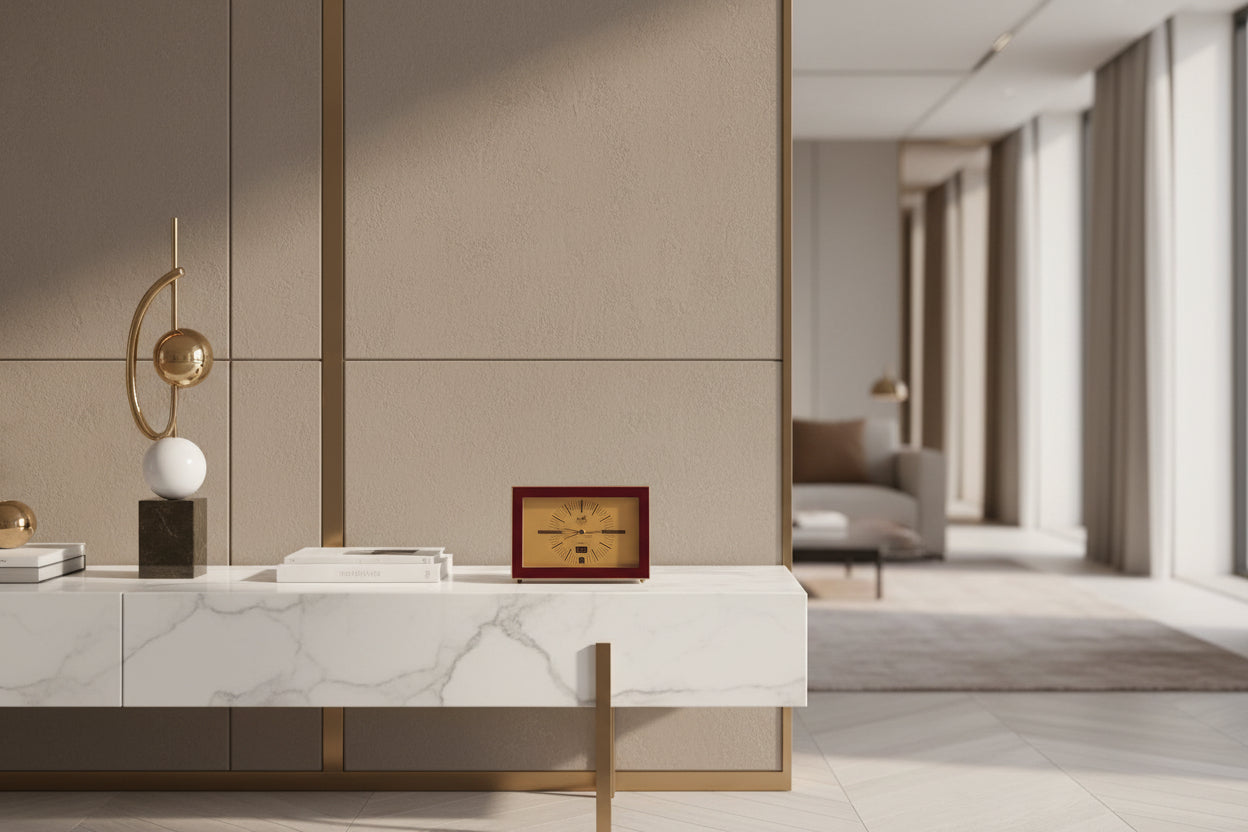 A fine and rare Rare Hermès Art Deco gilt brass and burgundy painted brass clock, dial signed "Hermès Paris" in brushed gold, black hour-markers and minute track, day and date windows at six o'clock, gilt hands. Quartz movement