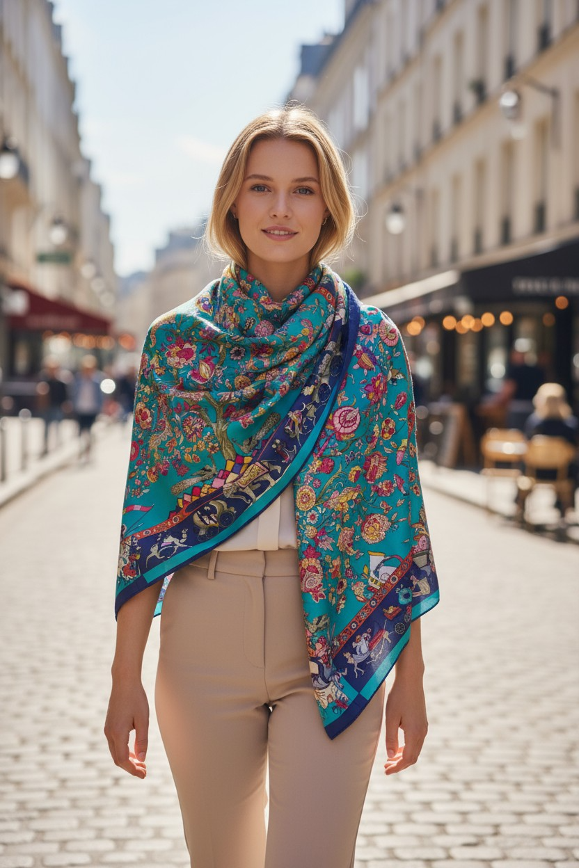 Crafted from luxurious silk twill and finished with hand-rolled edges, this 90 cm carré displays a richly detailed composition of floral patterns, ornate motifs, and delicate symmetry — a testament to Hermès’ exceptional craftsmanship and artistic vision.