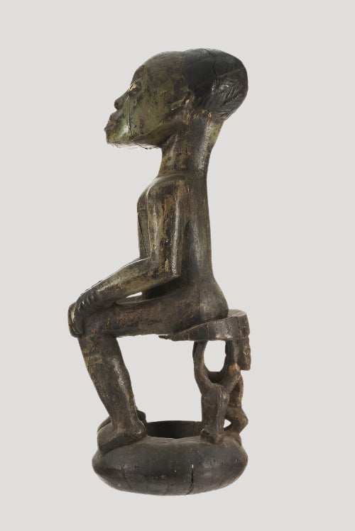 Beautiful and ancient male Bembe statuette, polychrome hardwood, representing a figure sitting on a stool, hands on knees, circular base.