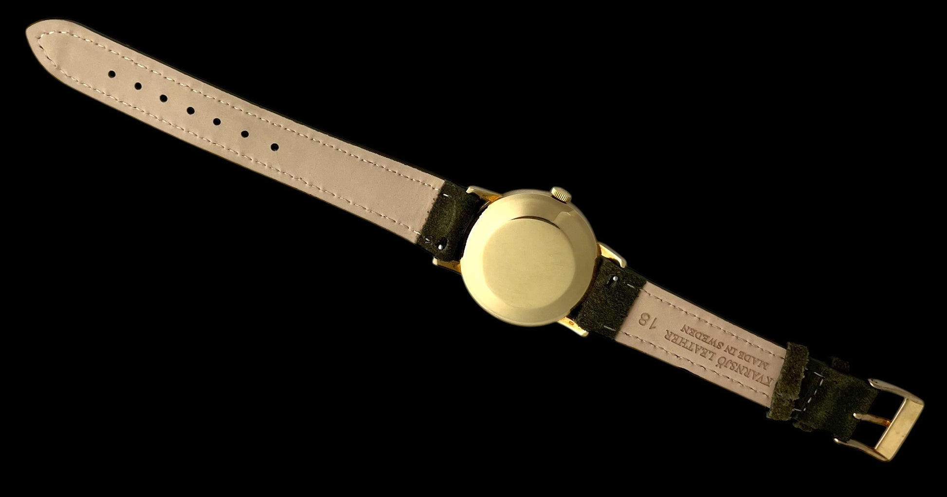 It is fitted with a suede green leather strap, handmade in Sweden, and a gold-plated buckle (not original). The crown is signed, and the watch remains in excellent, the diameter is 36.2 with crown.