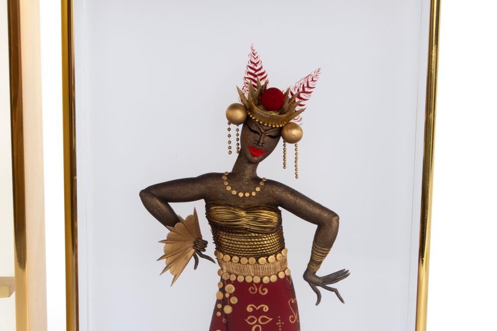 Gilt brass and engraved glass with flanking panels decorated with gilt and polychrome dancers