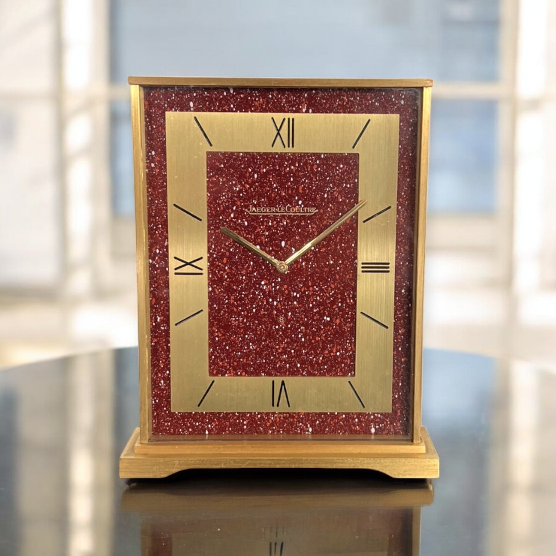 A fine and rare Jaeger-LeCoultre Table Clock with beautiful enamelled dial in Egyptian red porphyry, 1960s