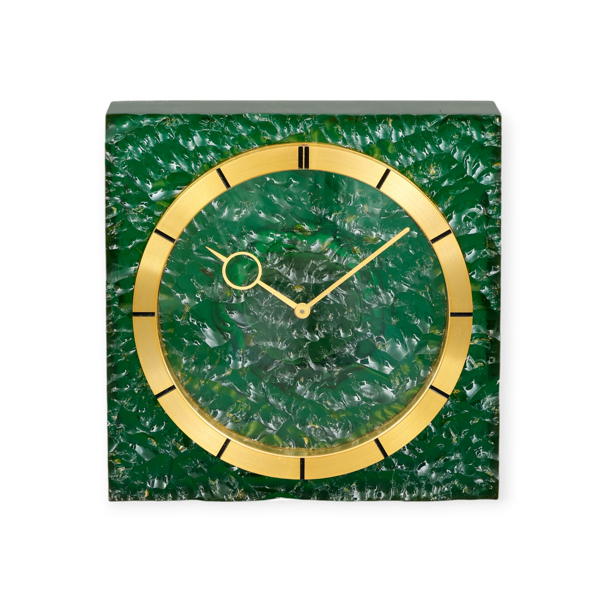 Angular case made of malachite-green resin, fluted on the front, brushed brass chapter ring with baton indices, brass baton hands, hand-wound movement, stamped "476",