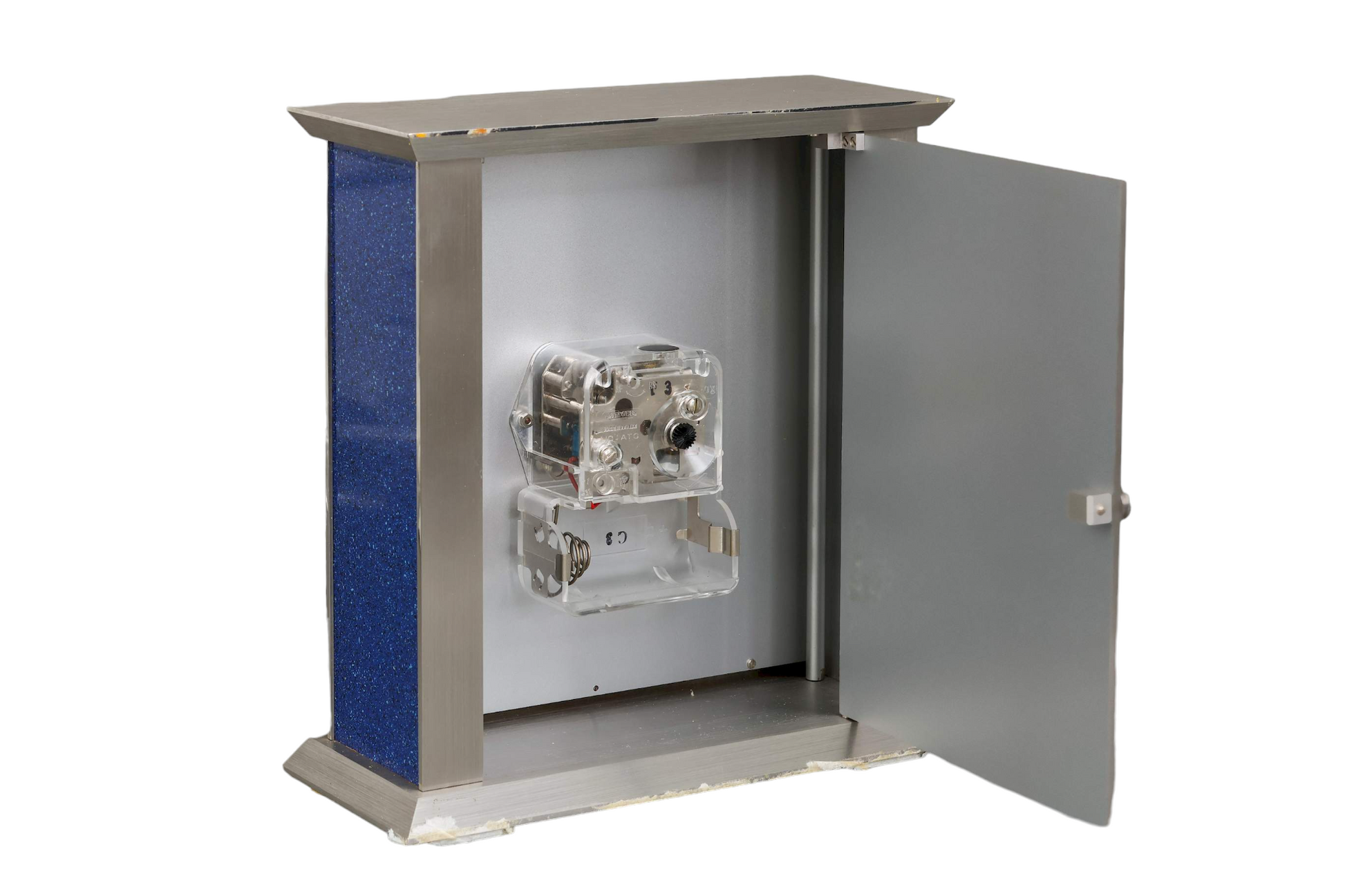 Angular brushed steel case, wall and dial with lapis lazuli fittings, 4 Roman numerals, stainless steel baton hands, centre second hand, battery-operated movement. approx. 20x19x7cm In its original box. Very rare, collector! A unique timepiece of rare beauty! |