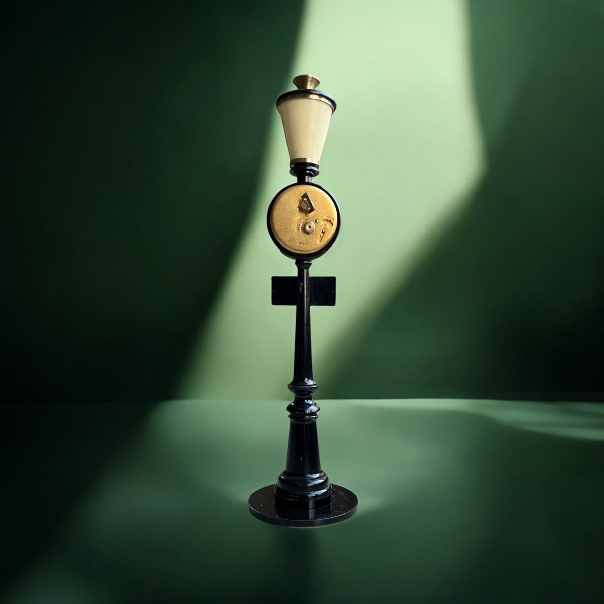A fine and rare Jaeger-LeCoultre Rue De La Paix table clock. Shaped like a street lamp, it bears the name of "Rue de la Paix", a Parisian street running from Place Vendôme to Opéra Garnier.