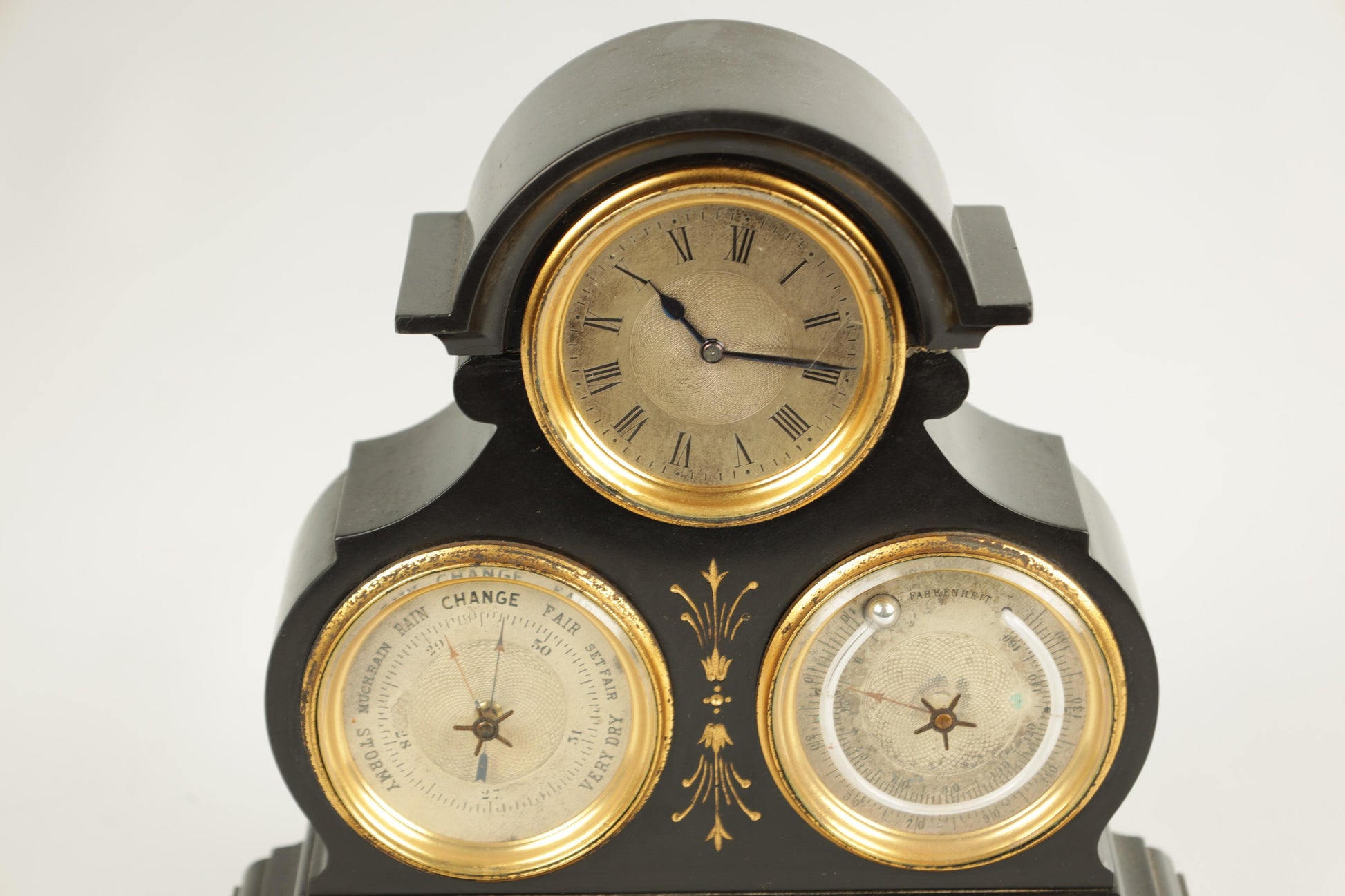 Marble and gilt brass clock with barometer and thermometer below a clock dial