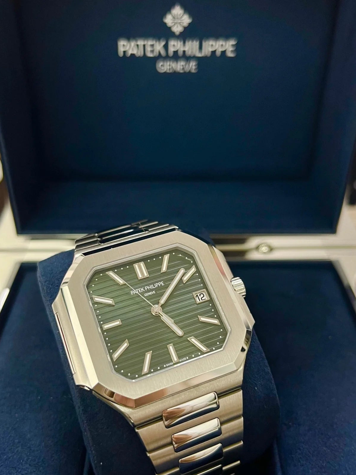 Dial: Sunburst olive green, horizontally embossed, white gold applied hour markers with white luminescent coating