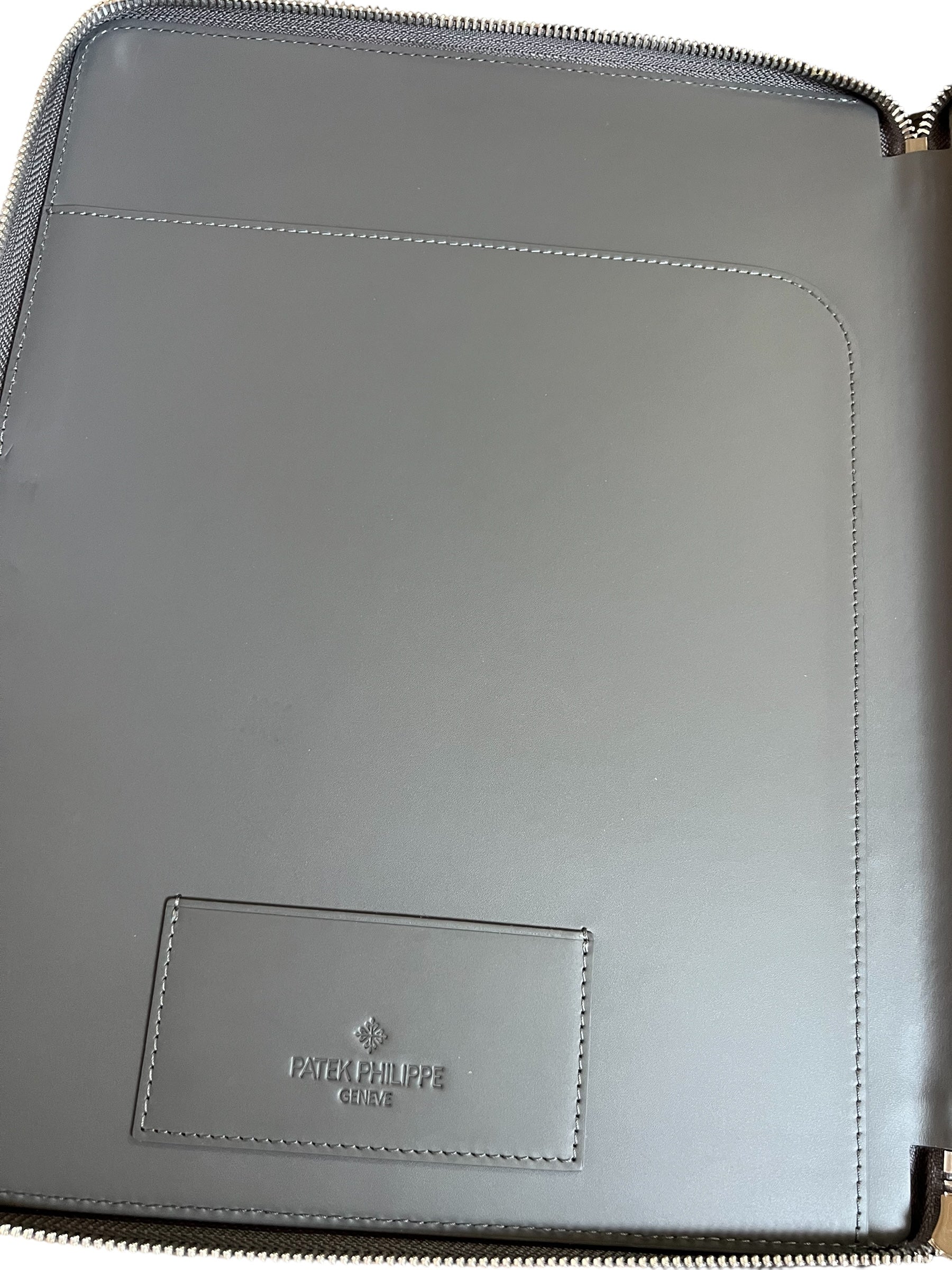 A fine and rare Patek Philippe New Grey Leather Briefcase with Patek Notebook, Caran d'Ache pen & Calatrava Cross Pin