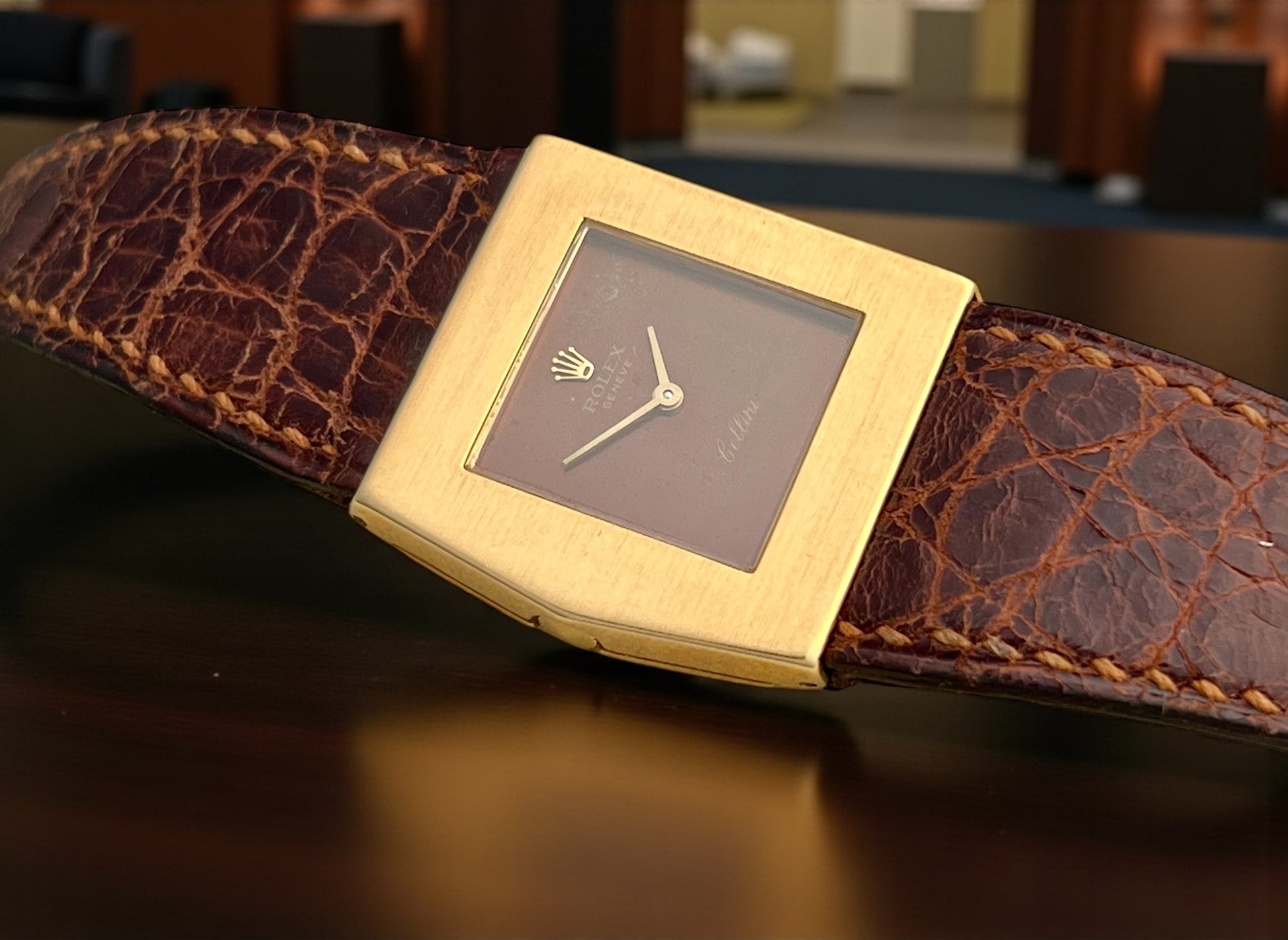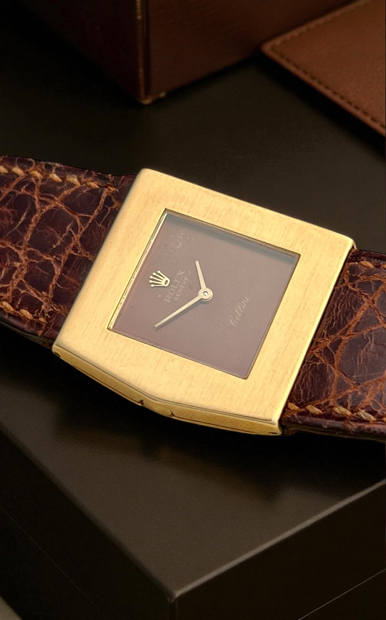 • Dial: Chocolate brown, crown in relief; signed Rolex • Genève • Cellini