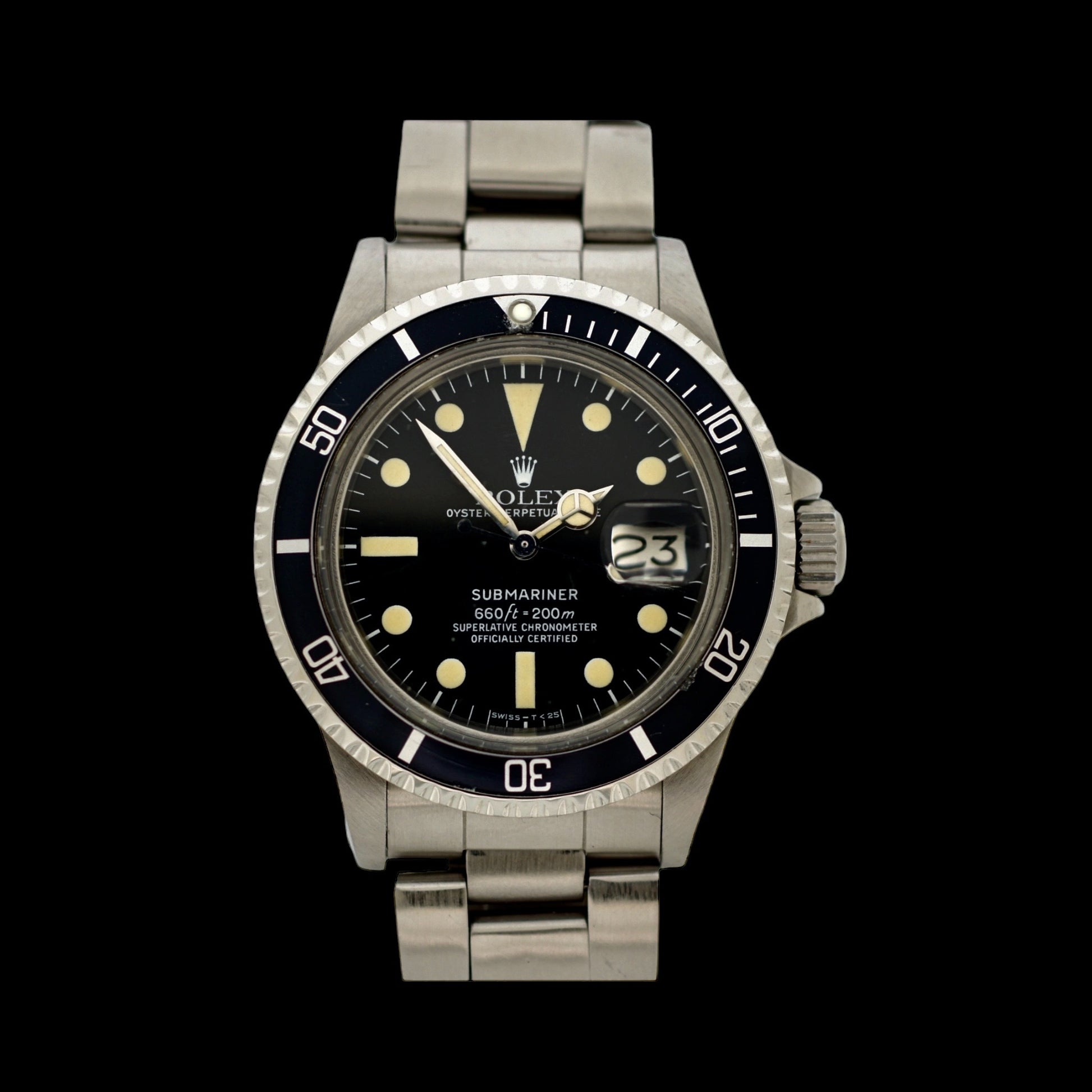 Overview: In 1969 Rolex launches the 1680, it is the first Submariner with the date function. It is equipped with a glass flat profile glass that exceeds 3mm from the edge of the bezel. For the first time on a submariner, a Cyclops lens is glued to the outside of the glass to make the date easier to read. The 1680 was produced until 1979 and makes part of the Submariners that are becoming more sought after by collectors.