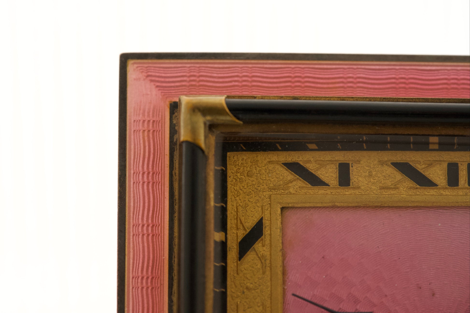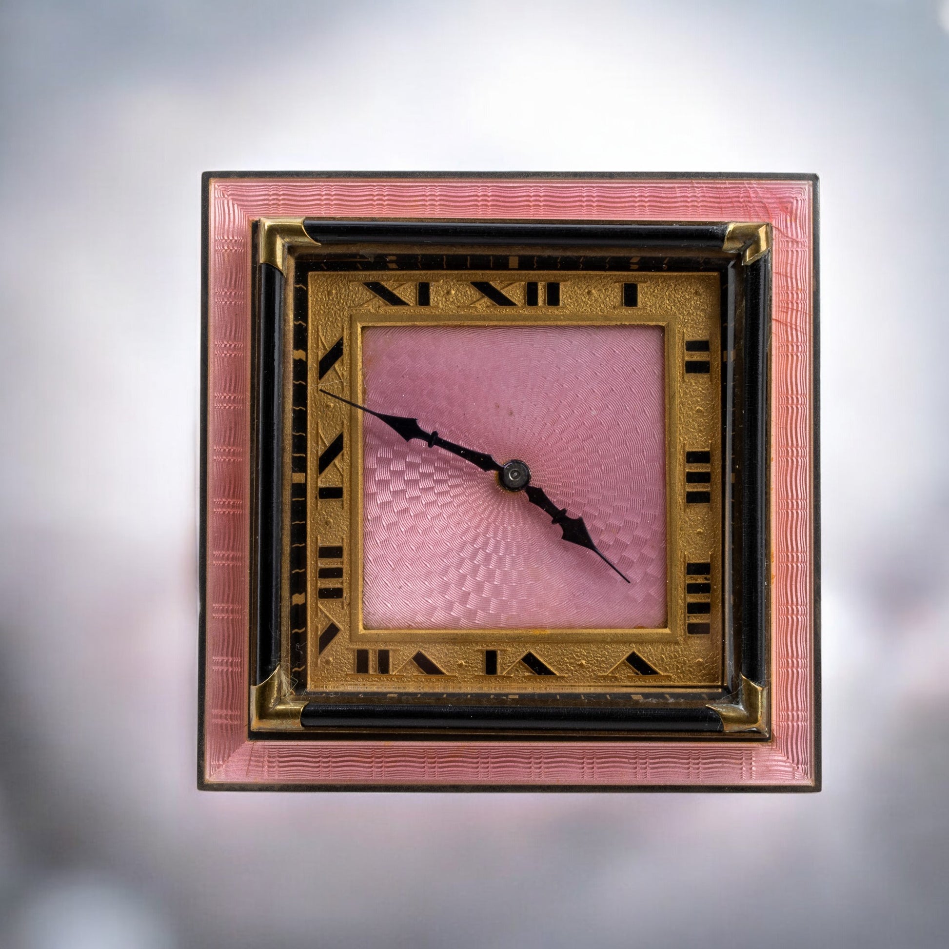 Beautiful Square case in gilt metal with guilloché enamel in shades of pink, dial with a gold bezel, Roman numerals, and black hour markers.