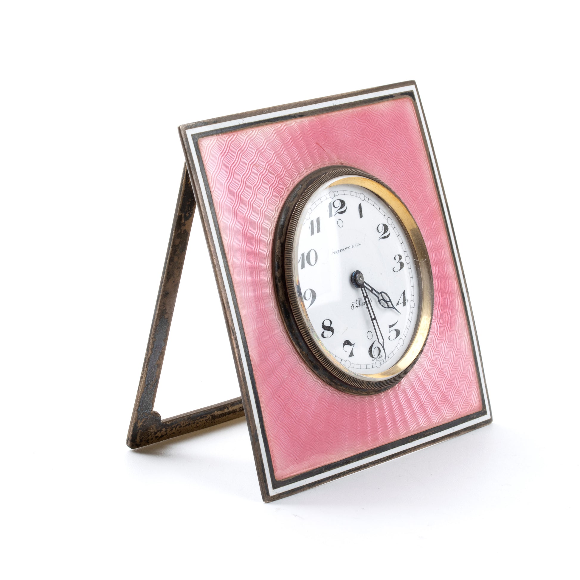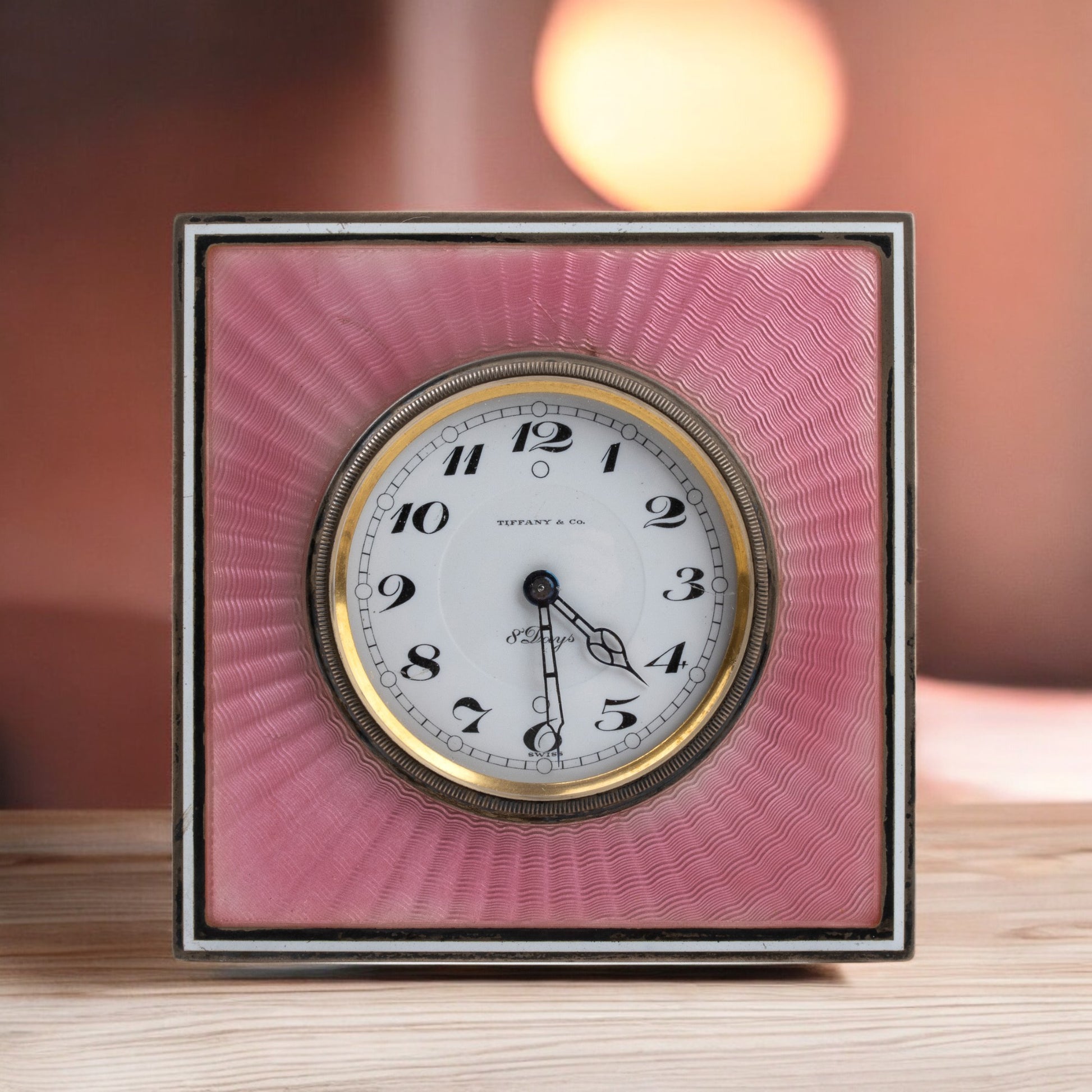 Beautiful square case in sterling silver with guilloché enamel in shades of pink with white and black borders, white enamel dial with Arabic numerals and black hour markers, featuring the inscriptions "Tiffany & Co. - 8 Days - Swiss".