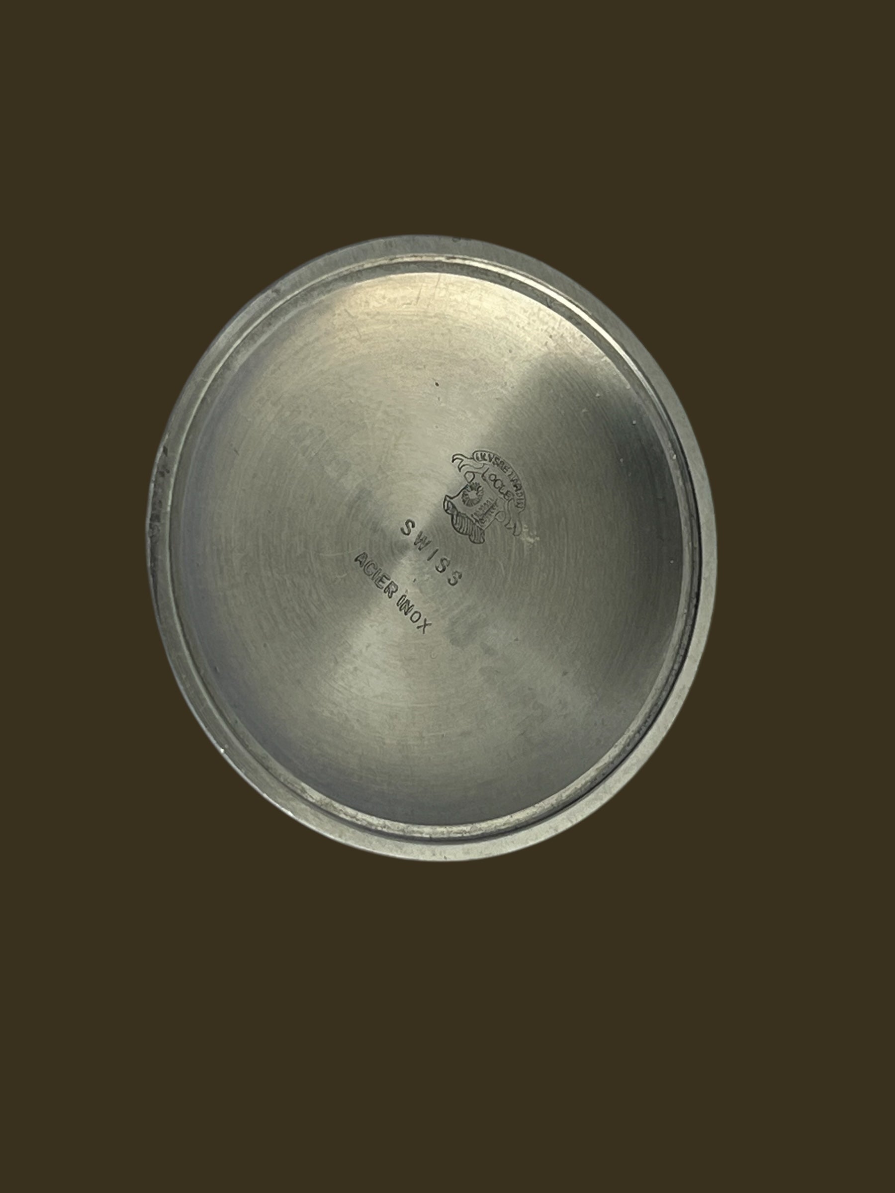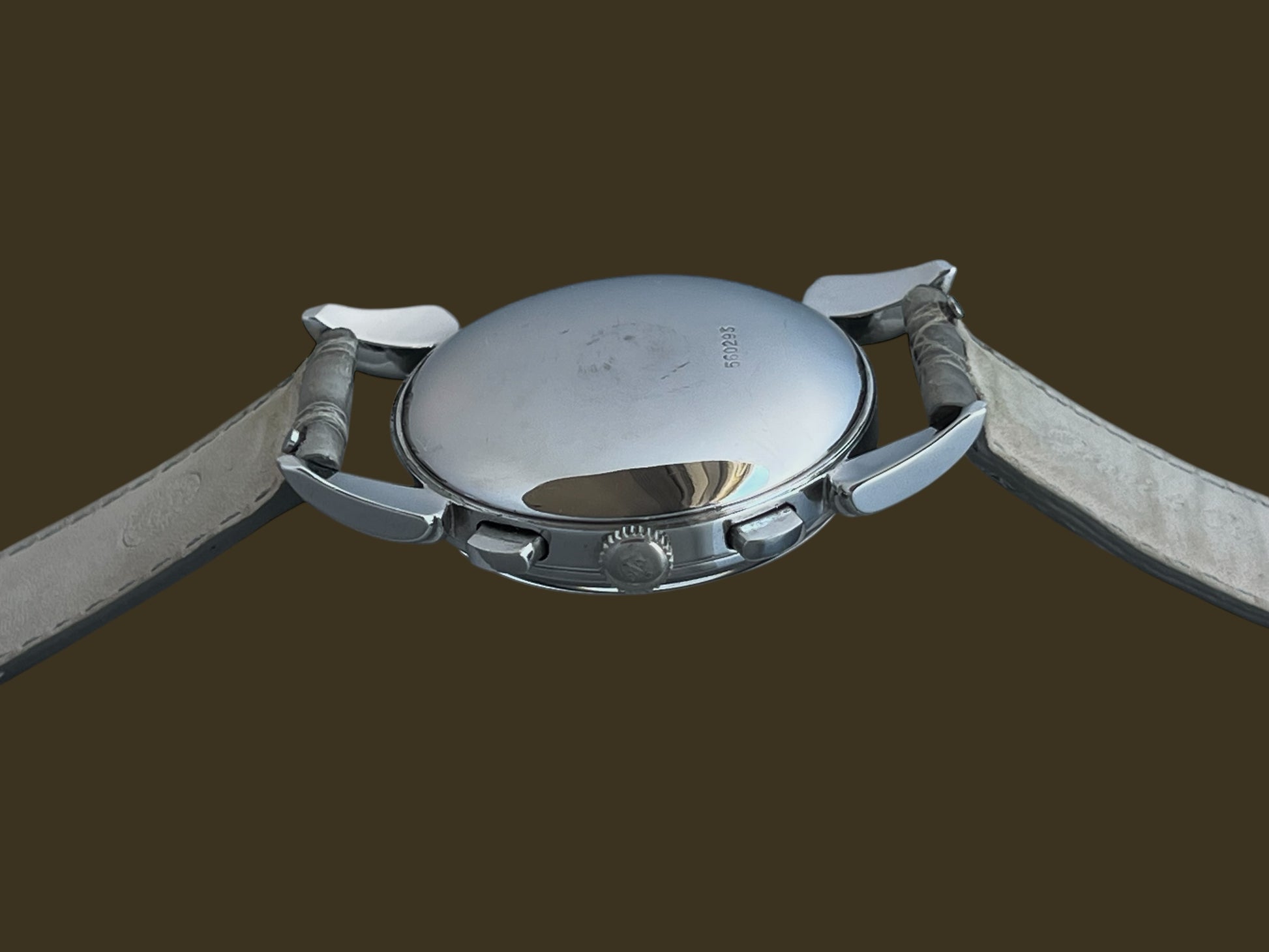 This jumbo 39 mm stainless-steel case — unusually large for its time — gives the watch a bold, sporty presence on the wrist while preserving a refined, classic elegance. The case stands out for its magnificent double “cornes-de-vaches” (horn-shaped) lugs, beautifully curved and sculpted, creating a sense of architectural harmony. These lugs are extremely rare and highly sought-after among vintage collectors.