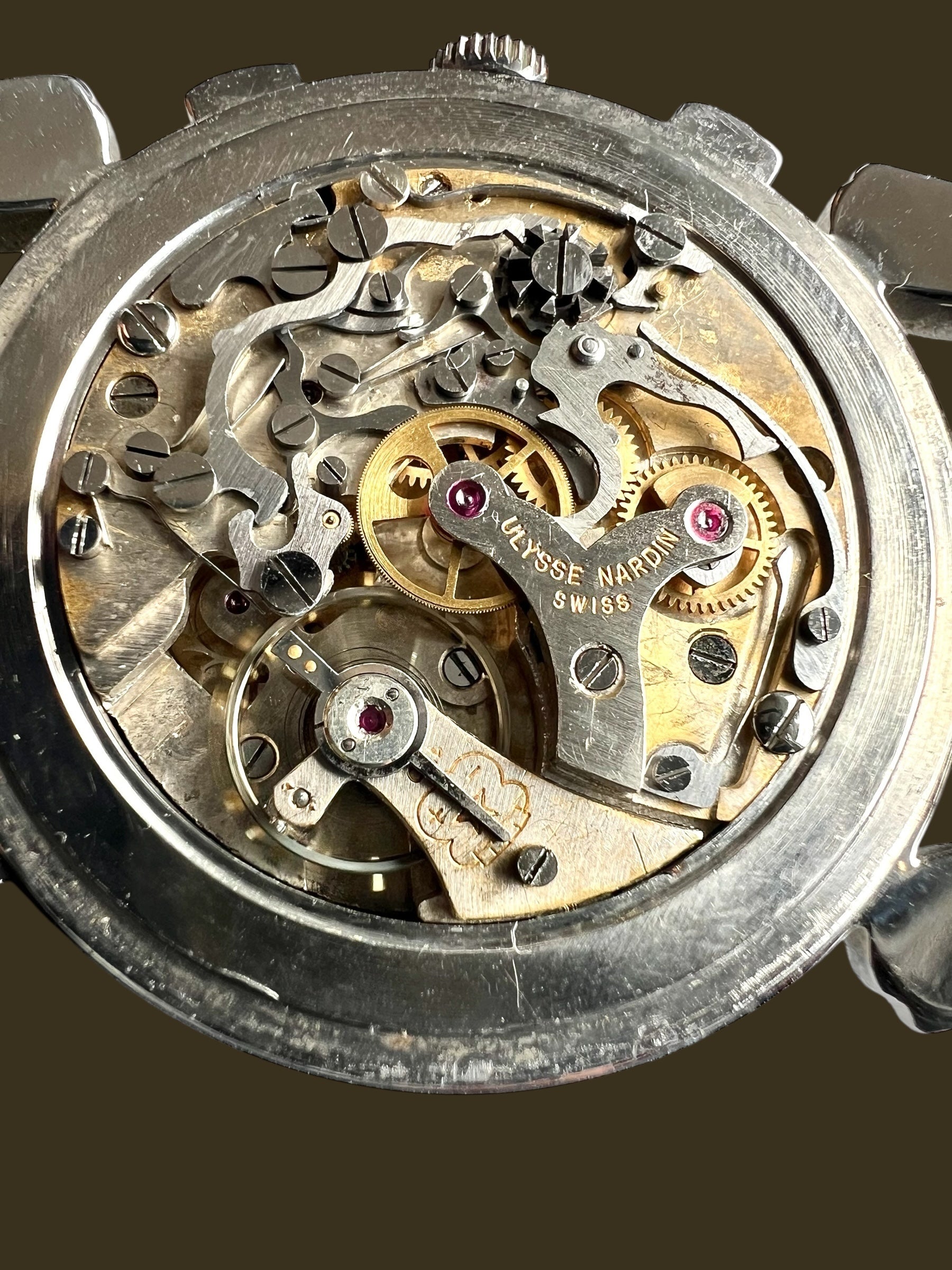 The manual-winding chronograph movement is fully signed Ulysse Nardin Locle Suisse, as are the dial and case, confirming its originality and authenticity. The case retains its square pushers, polished bezel, and satin-finished sides, remaining in excellent, well-preserved condition.