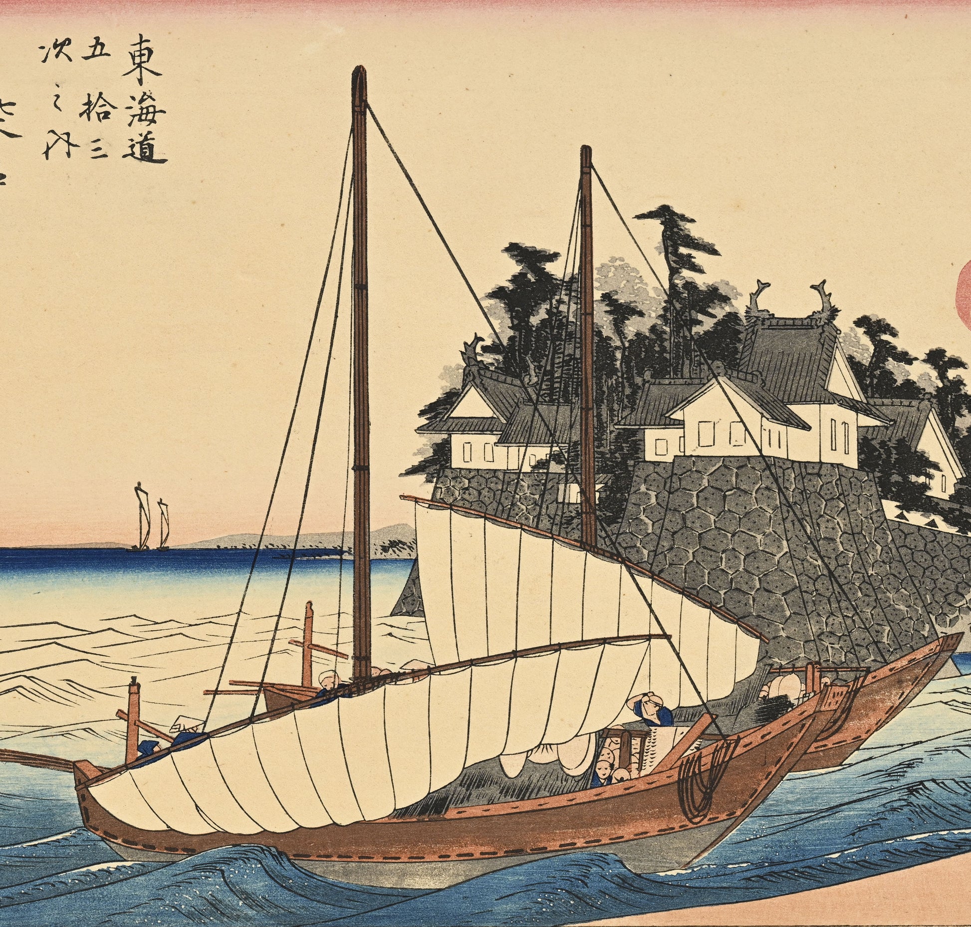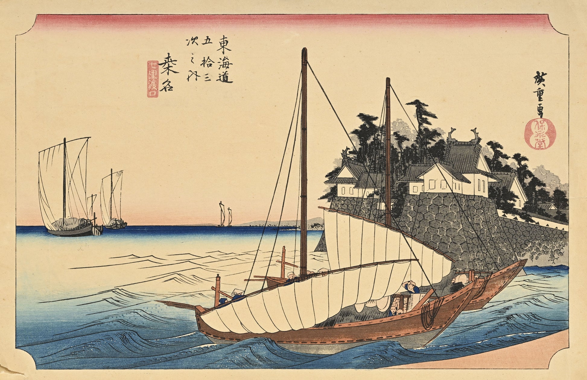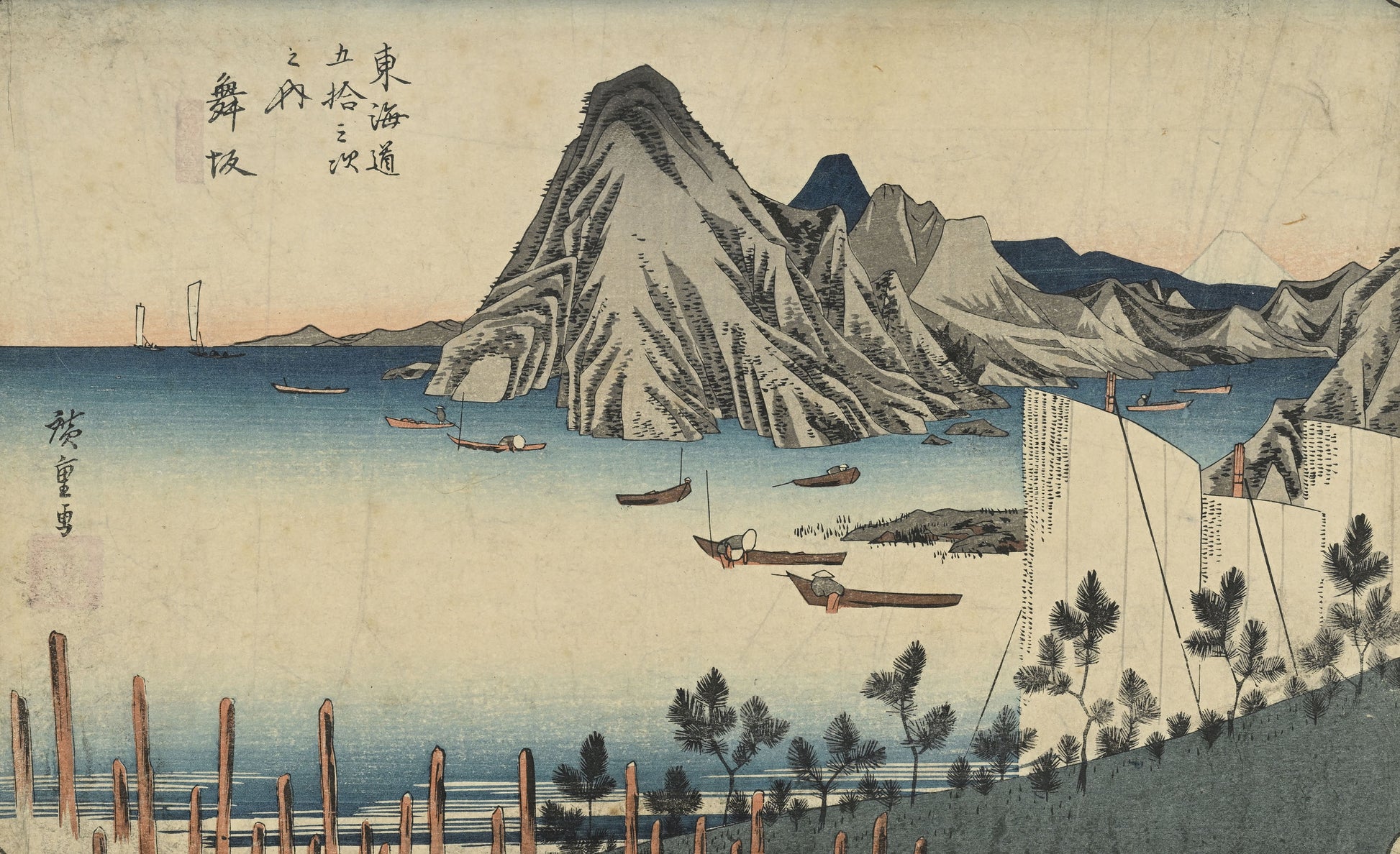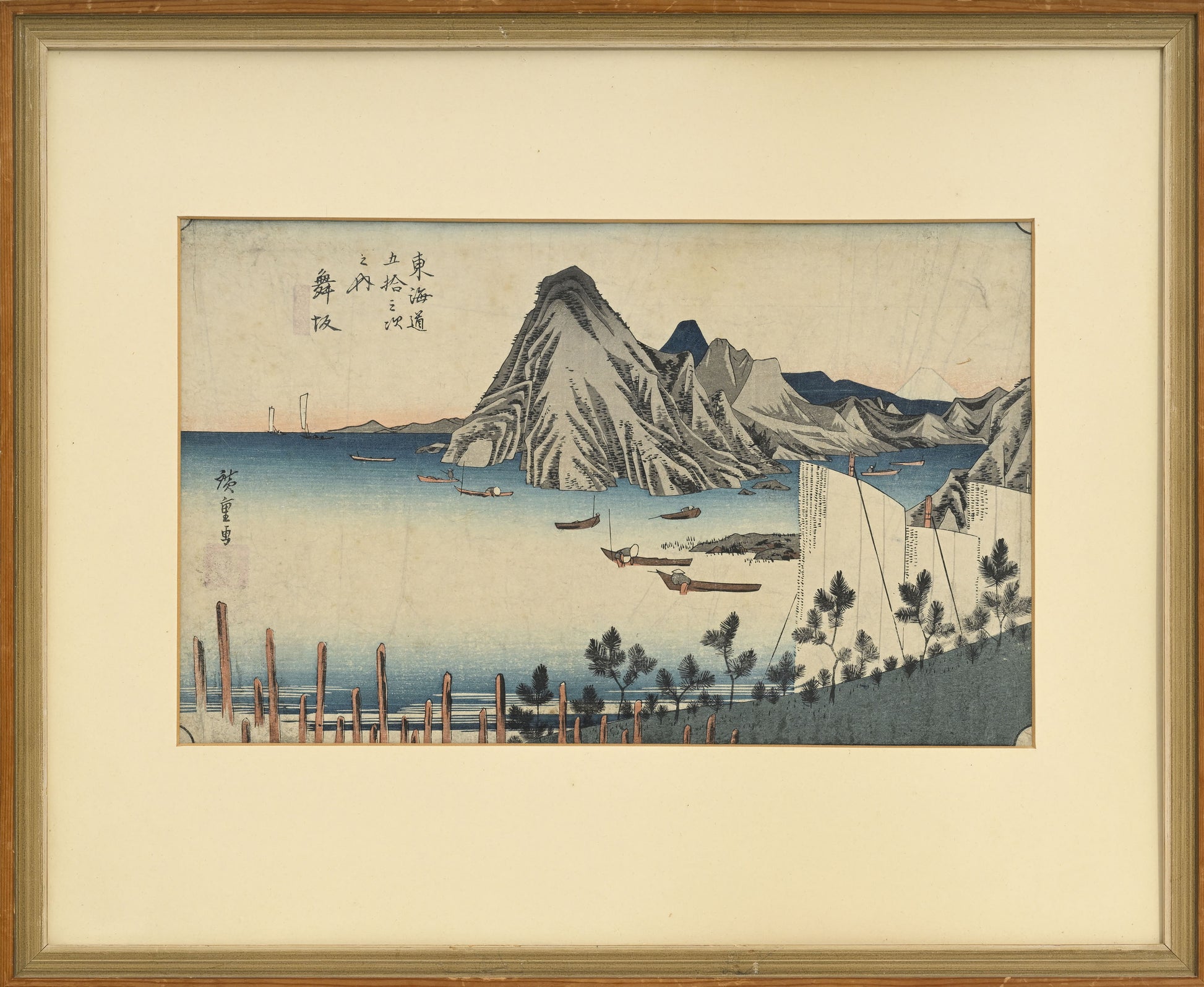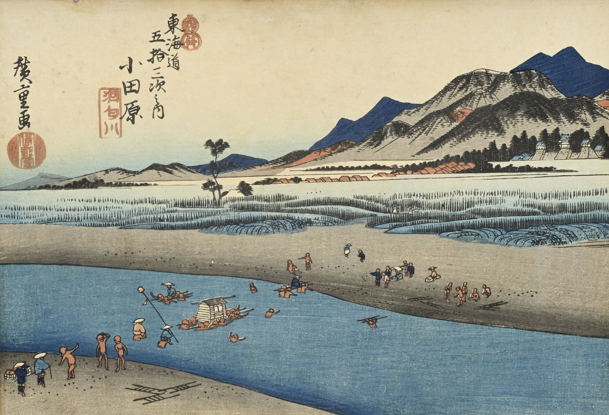Utagawa Hiroshige (1797-1858), set of 3 very Rare yoko-e prints, Japan, 20th century, from the series 東海道五十三次之内 (Tôkaidô gojûsan tsugi no uchi, ‘The Fifty-Three Stations’):