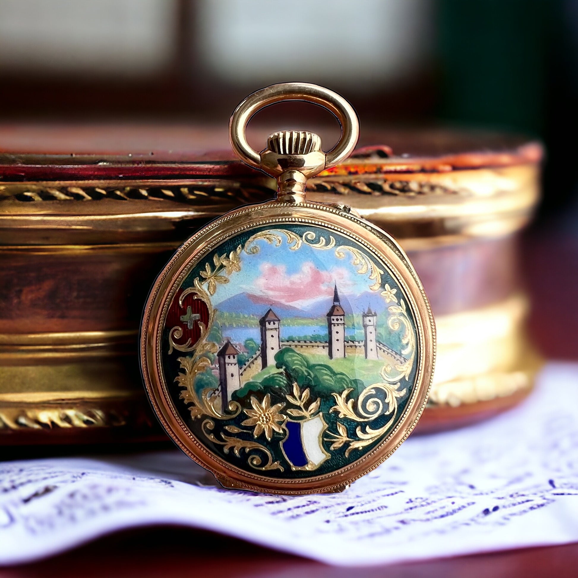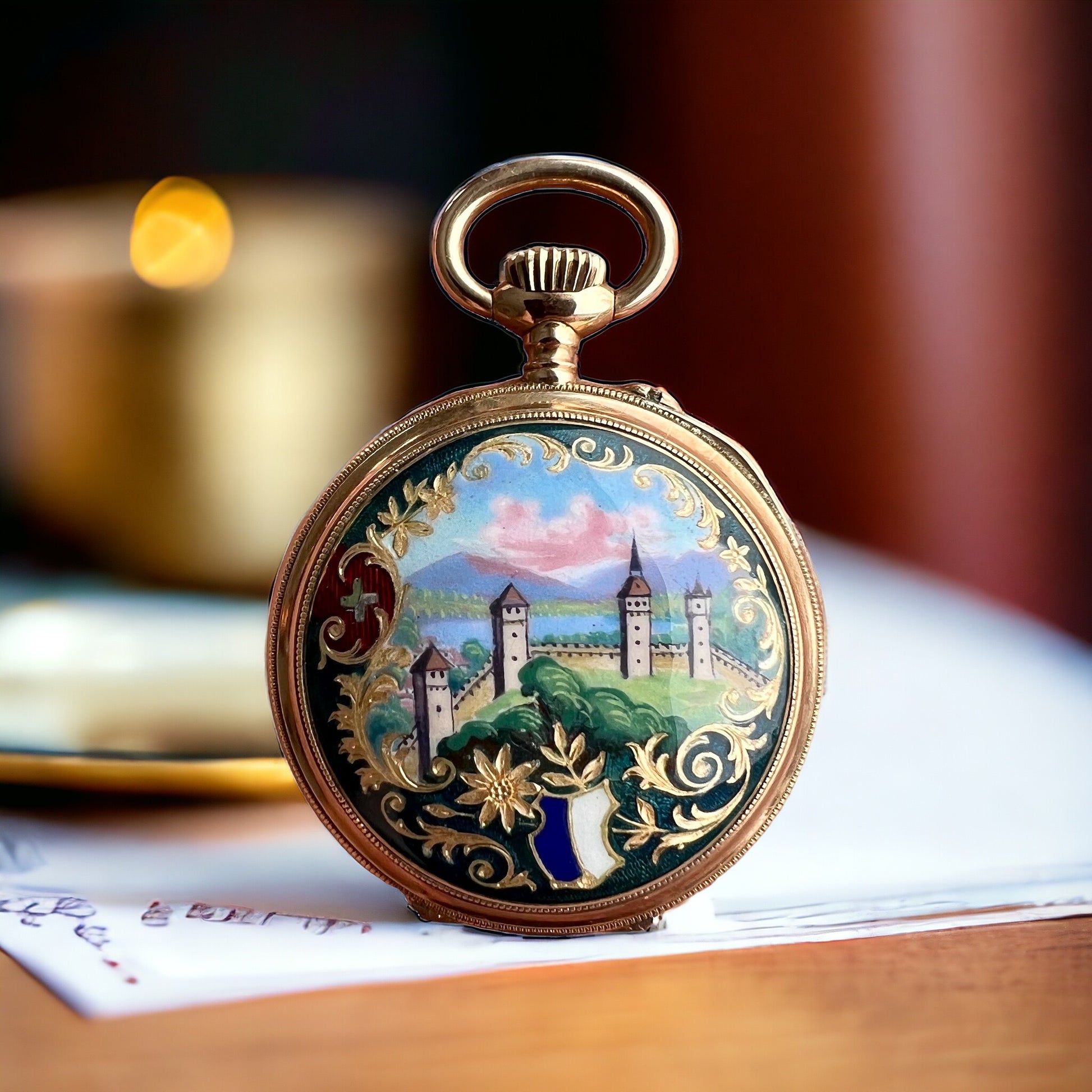 18k gold case, signed, with fine polychrome enamel painting "Museggtürme in Luzern", golden tendrils and Lucerne and Swiss coats of arms on the lid.