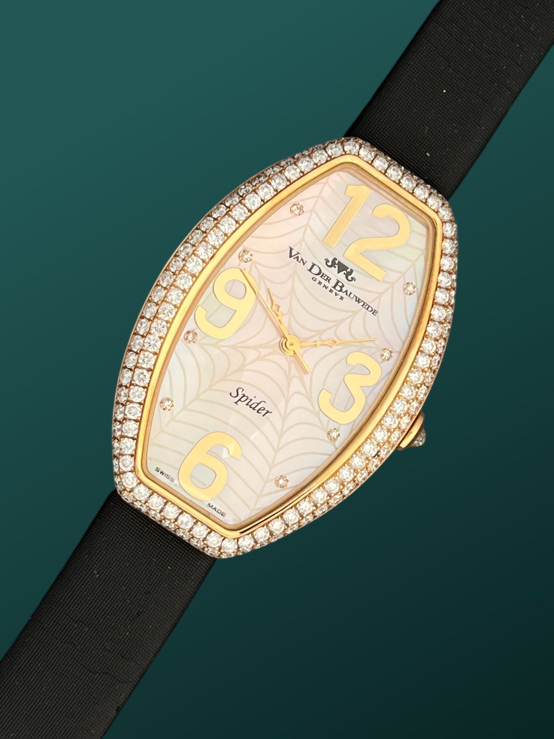 A beautifully refined creation from Van Der Bauwede Genève, this exquisite ladies’ watch represents the maison’s mastery of jewellery-inspired watchmaking: graceful proportions, precious materials, and understated opulence. Fully set with a double range of brilliant diamonds, the timepiece radiates a sophisticated brilliance that elevates it far beyond the realm of a traditional ladies’ watch.