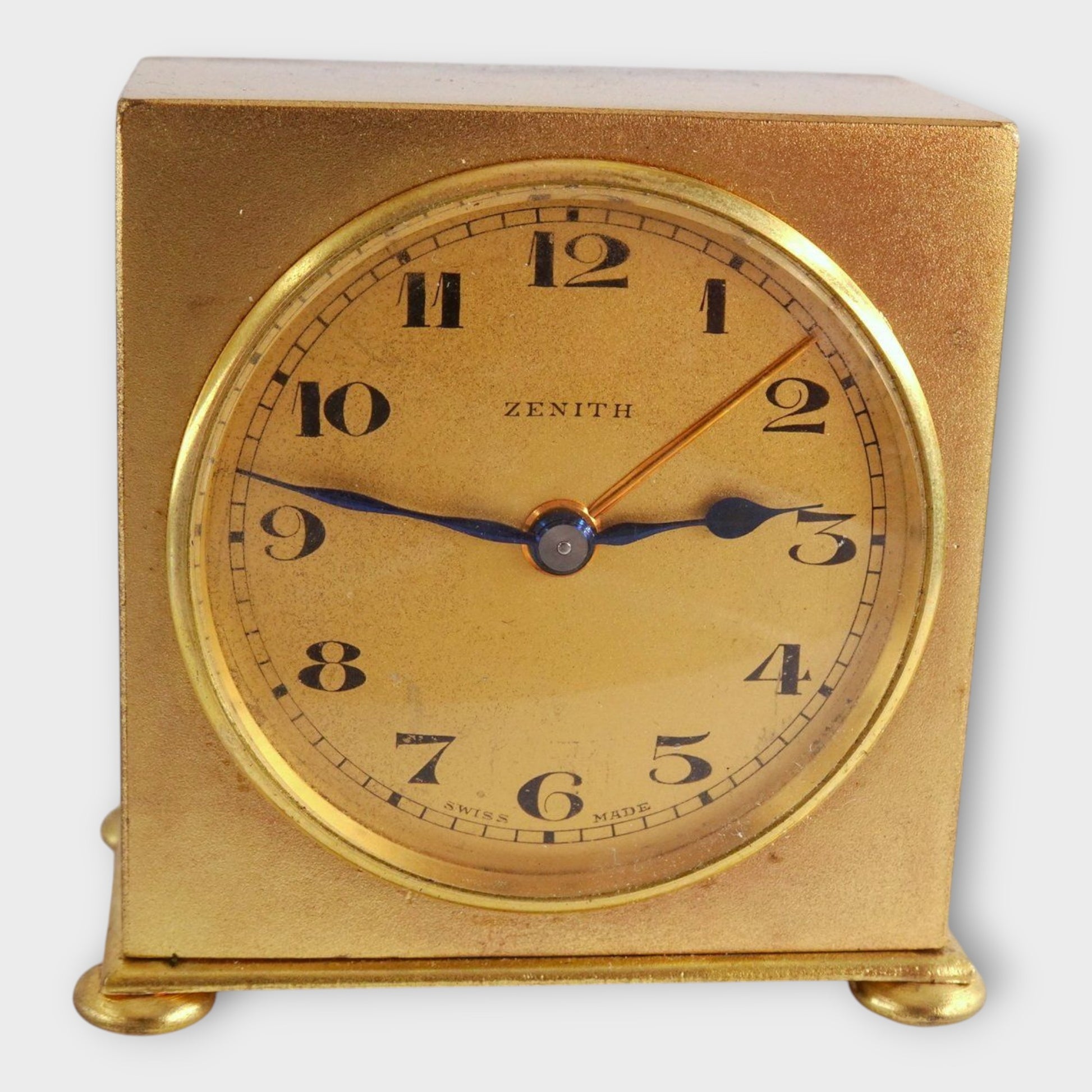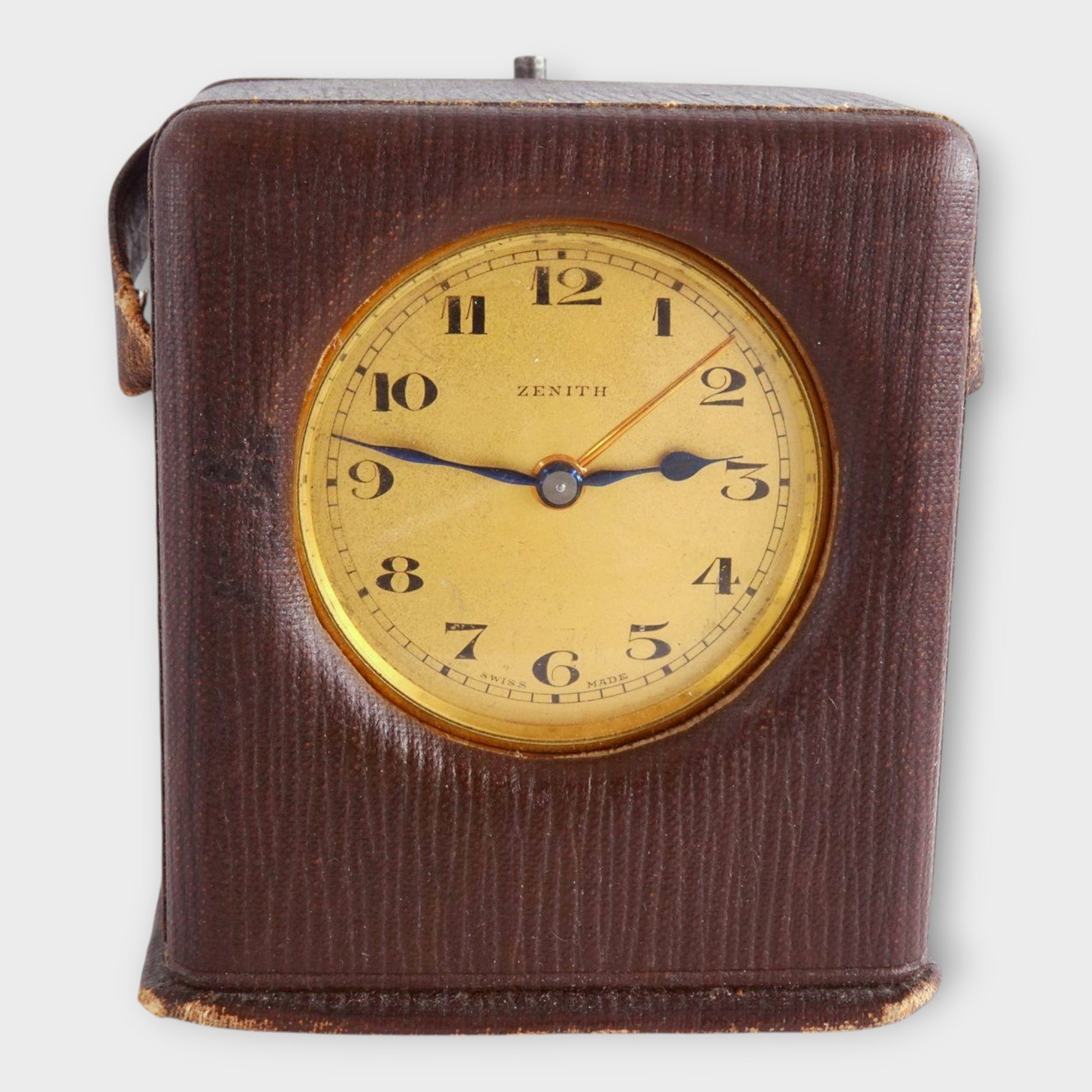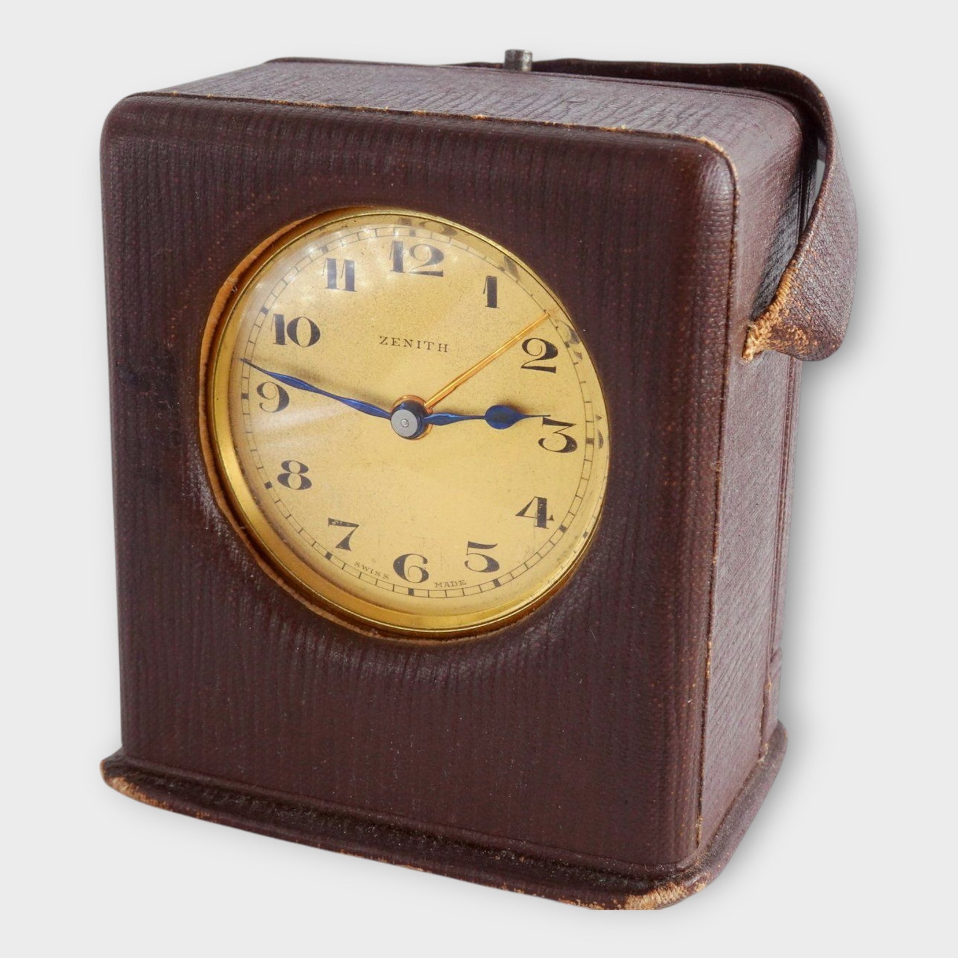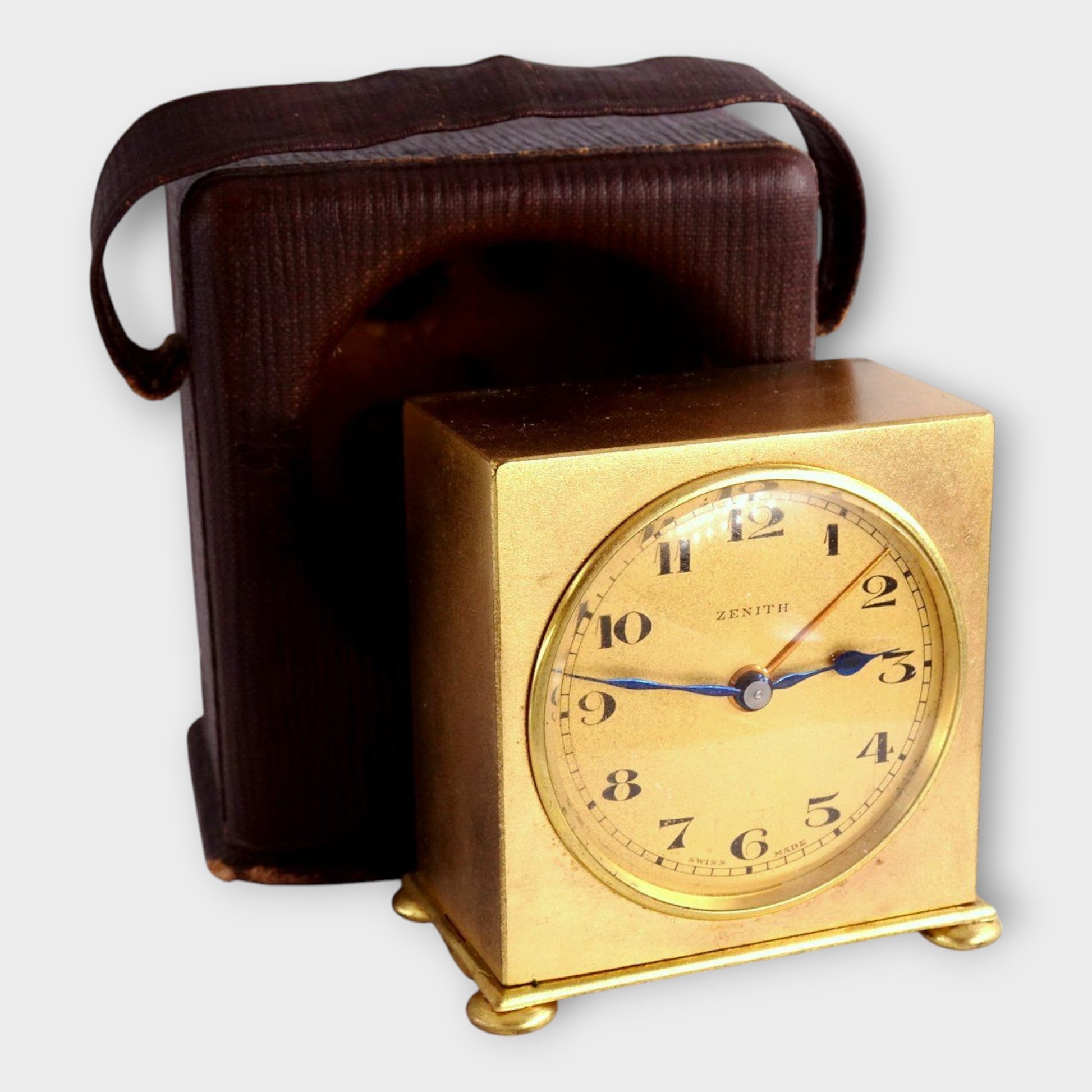 A fine and rare Zenith alarm table clock, from ca 1920' with its original Zenith leather box